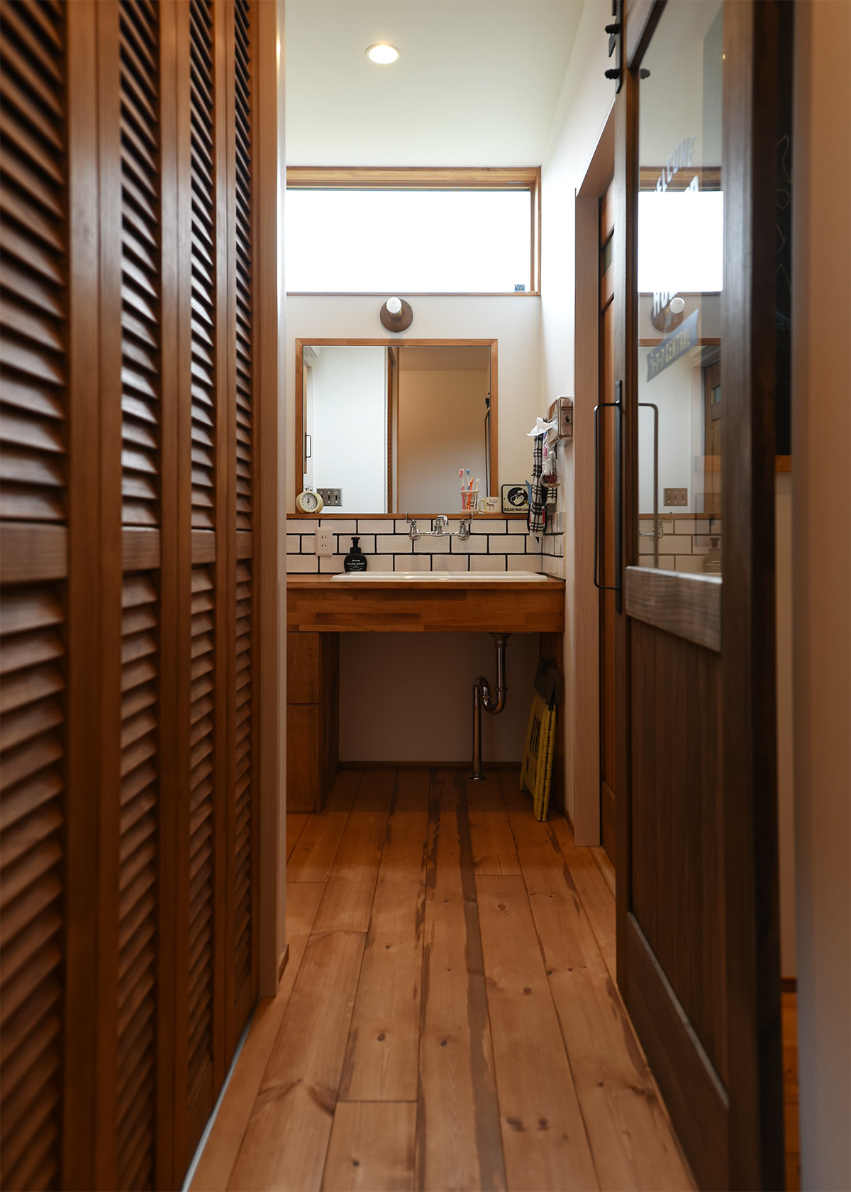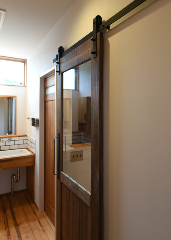 廊下突き当りに洗面所。洗面ボウルは深型幅広タイプ。右側のドアの吊りレールは納屋風スチール製。