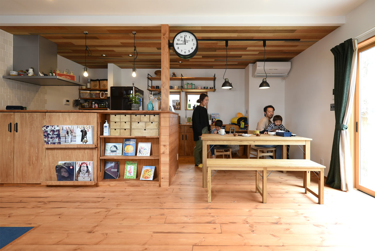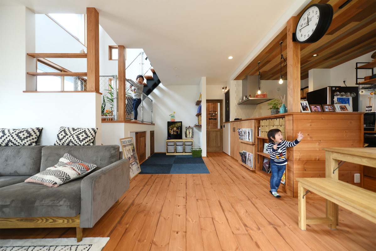 今回の建主様は、ご夫婦と6歳と3歳の男の子2人の4人家族。以前はアパートにお住まいでしたが、家の中でも元気いっぱいの2人のお子さんに「走らないで」と注意するのがストレスだったと奥様。思い切り走り回れる家に住まわせてあげたい、と家づくりを考え始めました。 「最初は全く知識がなかったのでハウジングプラザなどを回りました」というお二人ですが、テイストや予算でなかなかピンとくる会社に出会えず。ハウスメーカーや工務店を何件も訪ねて、最後に選んだのは木樂工房でした。