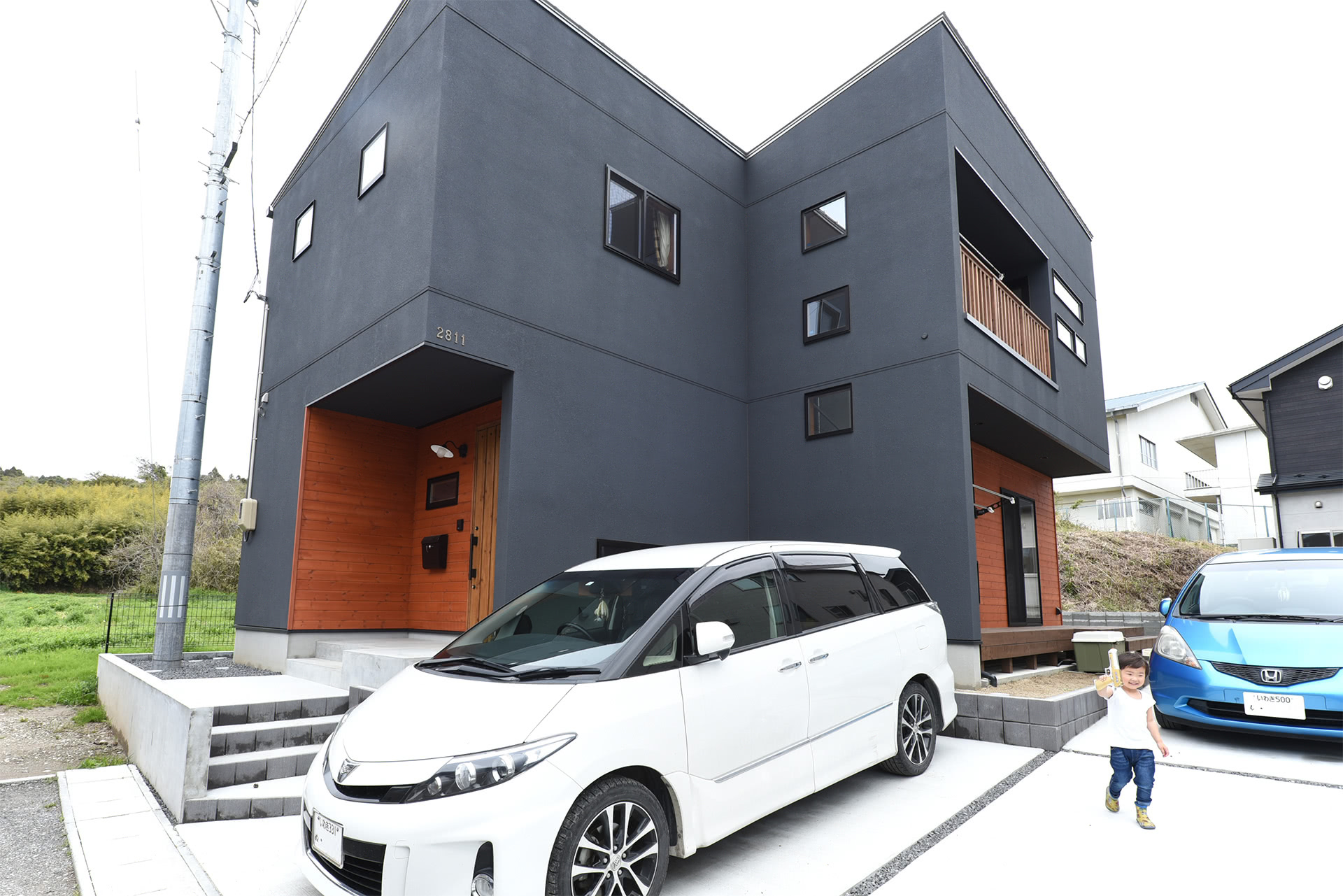 シンプルモダンでスクエアな外観に、赤茶に塗装した唐松でアクセントを。さり気なく番地も入ってますね。