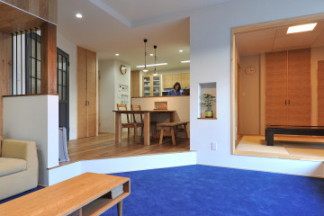右側のインディゴ色の床はデニムの置き畳。木樂工房の直井さんが自らウォッシュをかけて色出ししました。小さな開口部が秘密基地への入り口です。