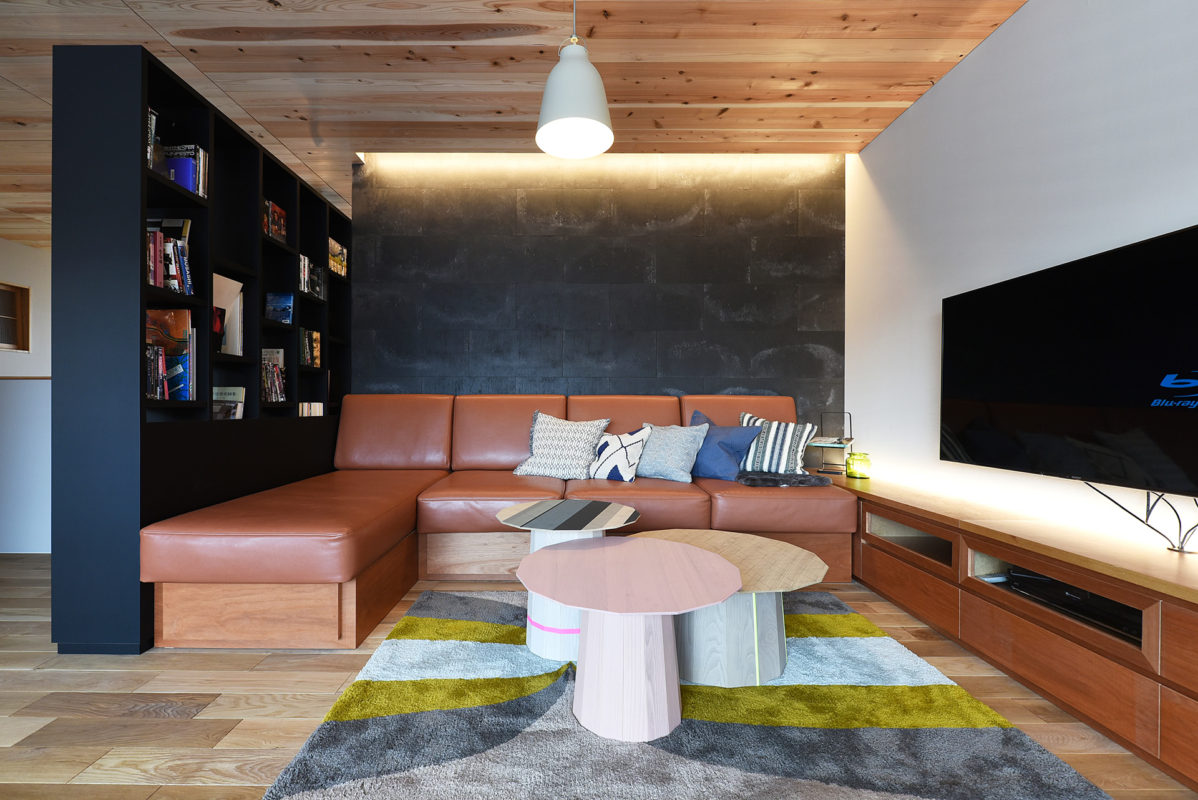 こちらは壁に溶岩プレートを使い、黒とダークブラウンで大人の雰囲気のリビング。