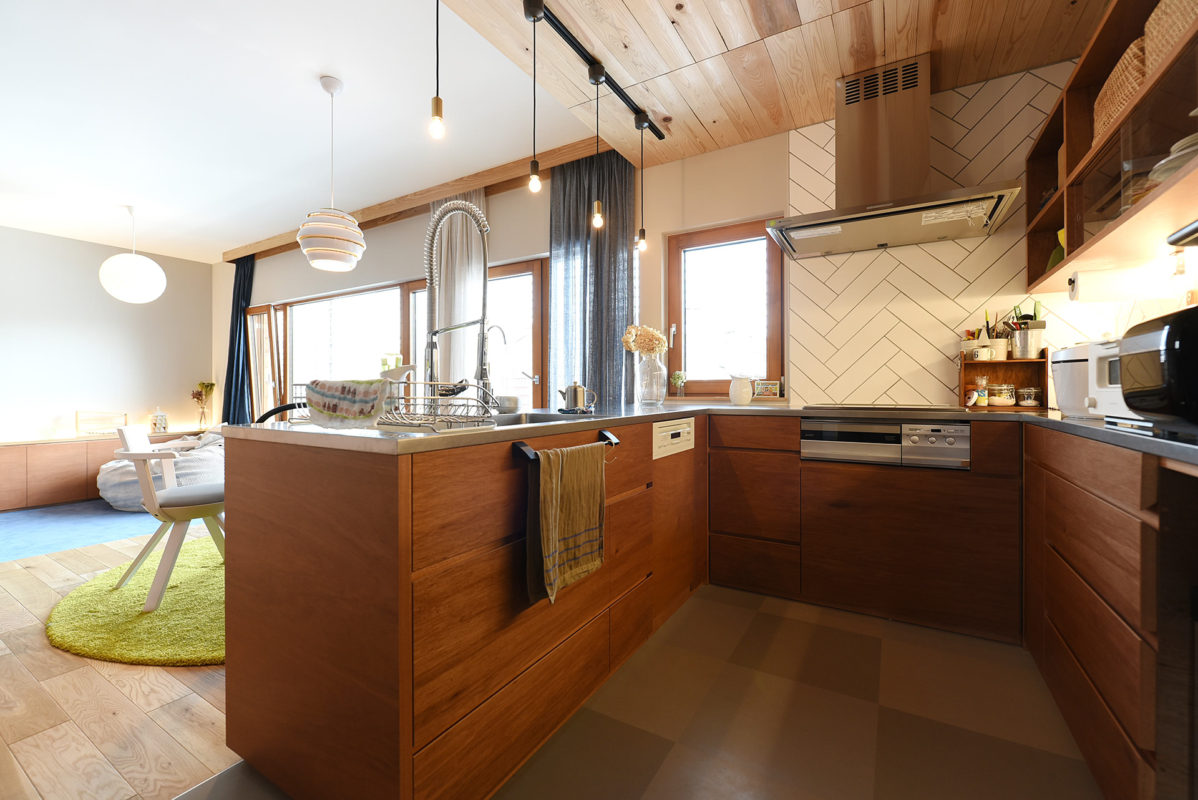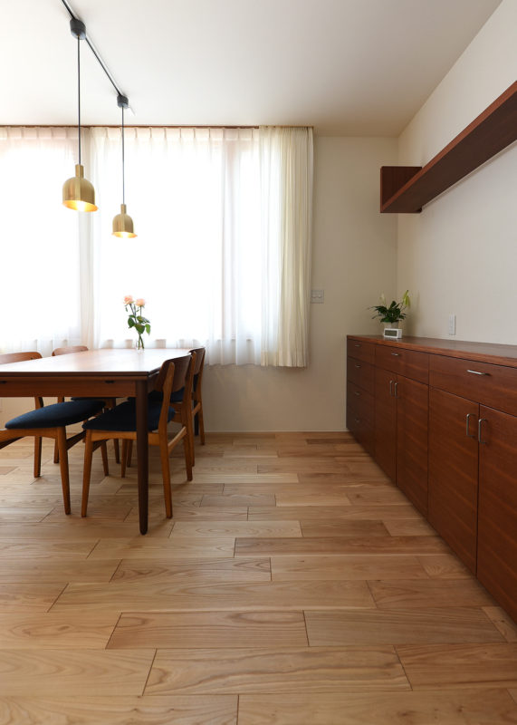 柔らかな日差しと無垢感溢れる空間は。室内の計画的空調と相まって居心地の良さそうな空気感を醸し出しています。床材は北海道産のニレ。