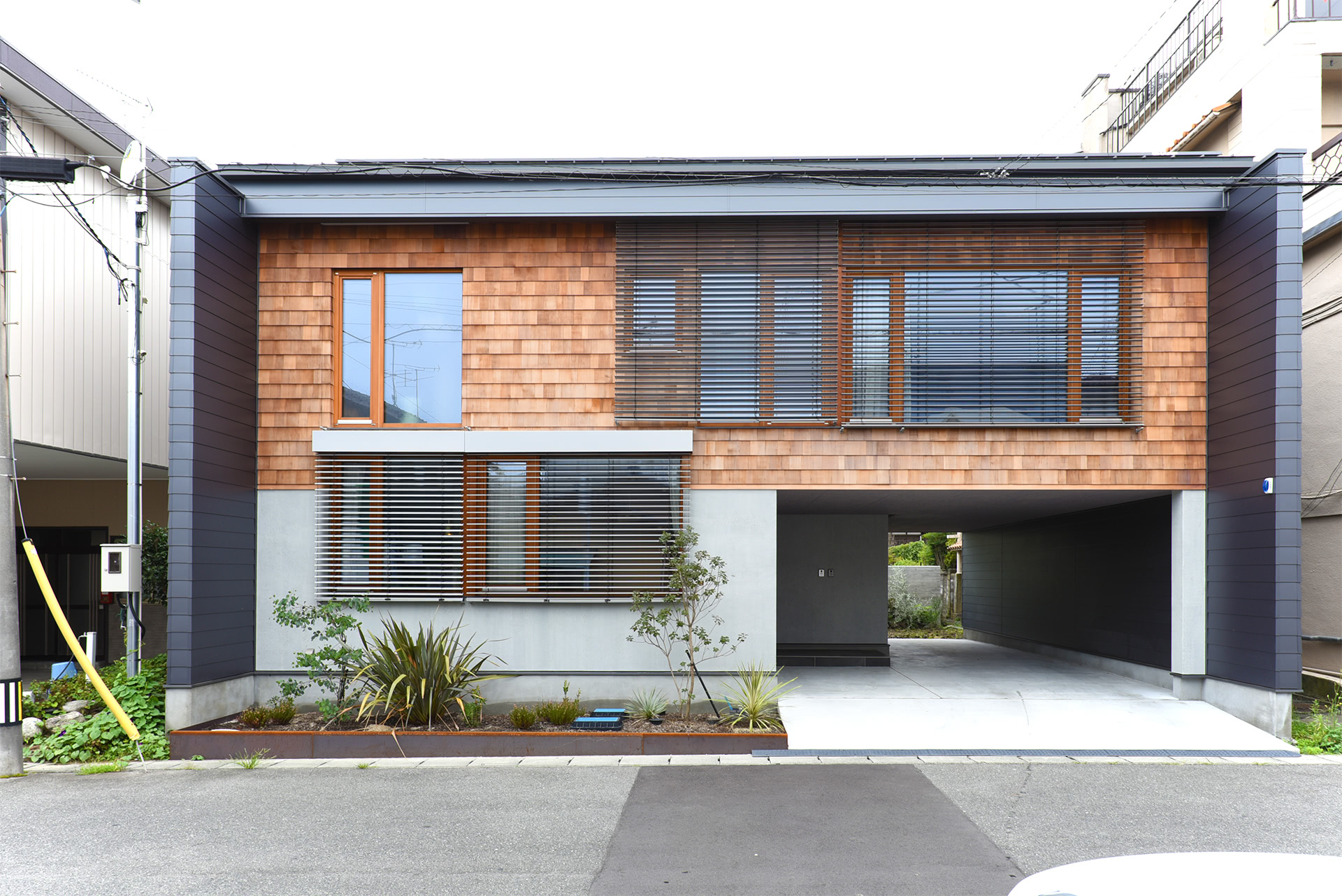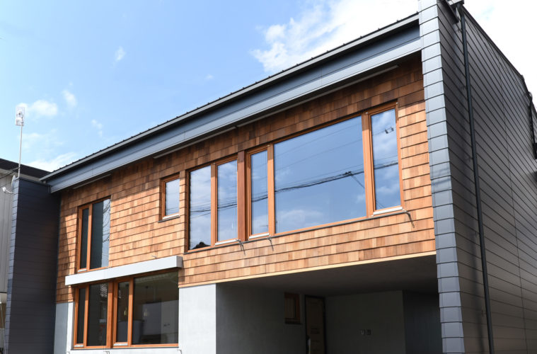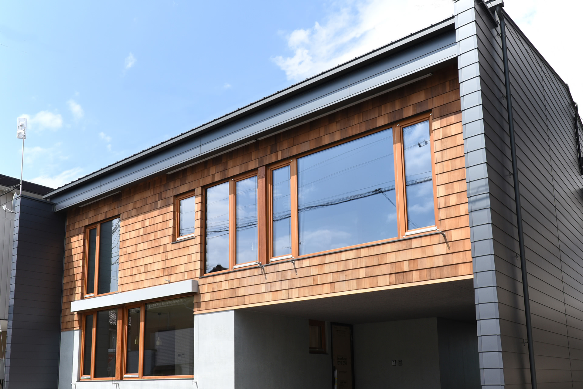 ガルバとレッドシダー貼りの外観。防火用に両側に出した袖壁が卯建(うだつ)のようで懐かしい港町風情を感じさせます。敷地が準防火地域のため、サッシを網入りにしなければなりませんが、この袖壁を出すことにより解消できます。2重断熱+トリプルガラスサッシでC値0.1c㎡/㎡、UA値0.22W/㎡kという最高レベルの高気密工断熱を実現。外付けブラインドにより日射も効果的にコントロールしています。また屋根には太陽光発電に加え太陽熱温水器も設置して電力と給湯を創エネしています。
