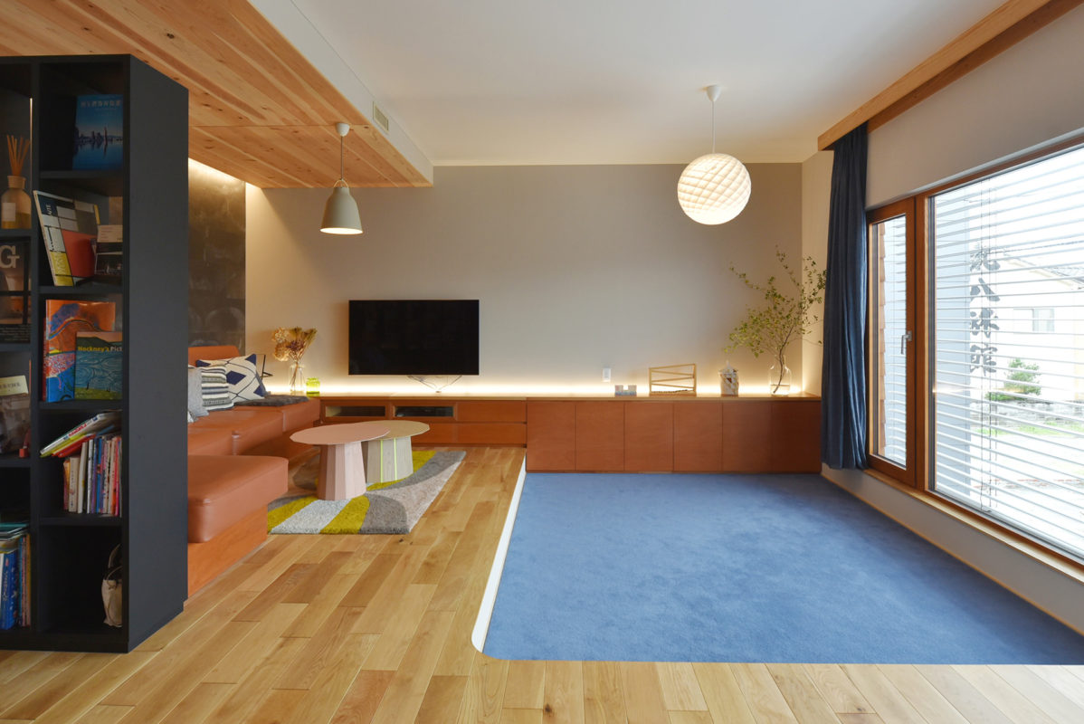 造り付けのローボードと間接照明が部屋を広く見せる効果も。ゆっくり過ごせる大型ソファーと、ゴロゴロできるピットリビングと二通りのくつろぎ方が出来ます。