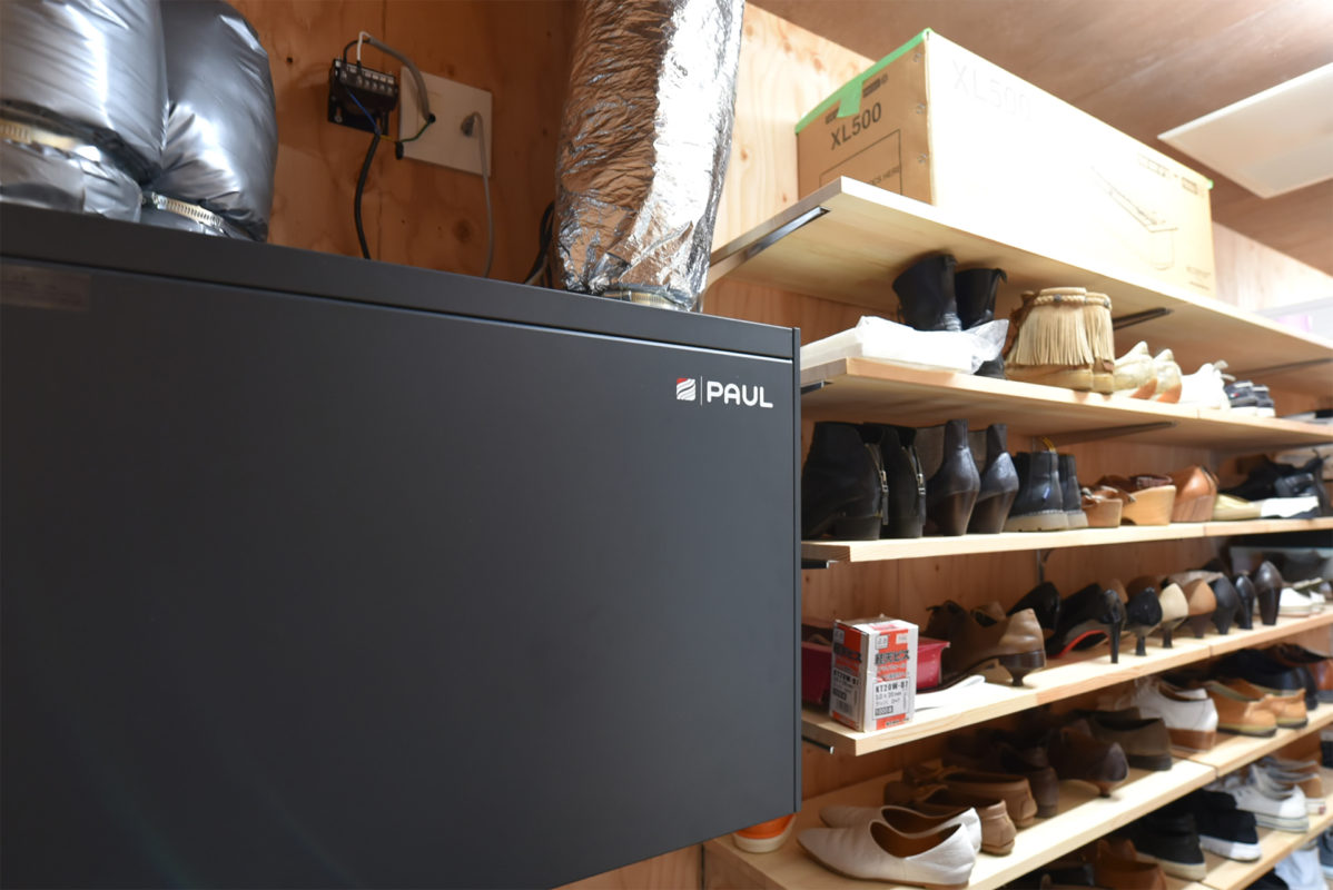 後田社長の自信作!エアコンに屋内外の換気と冷暖房を同時に行えるドイツ製の熱交換型換気装置をドッキング。冷暖房された新鮮な空気は、ダクトを通して全部屋に供給され家全体が快適な室温に。