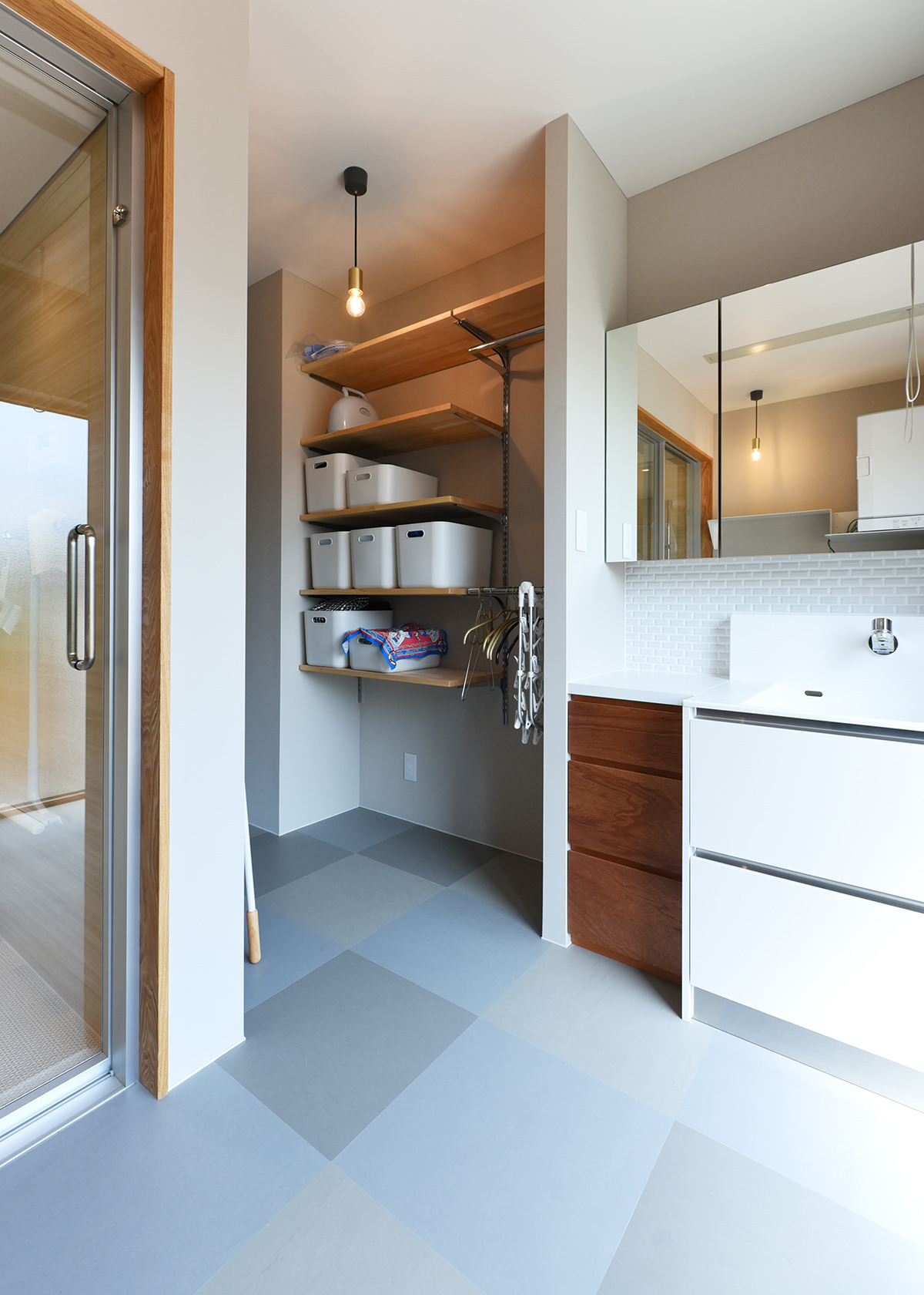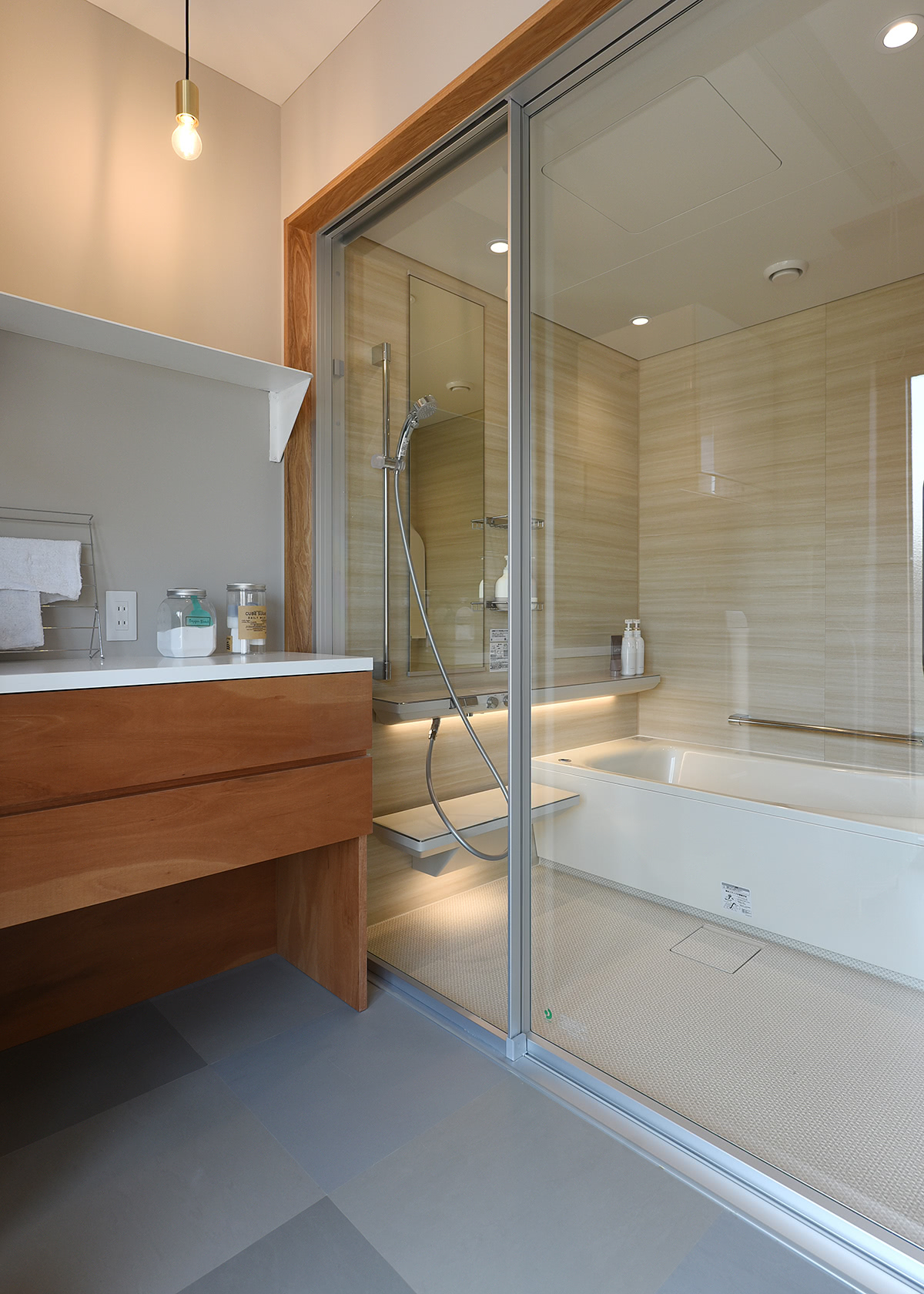 南面にバスルームとサニタリー。全面ガラスで浴室の奥まで明るく。