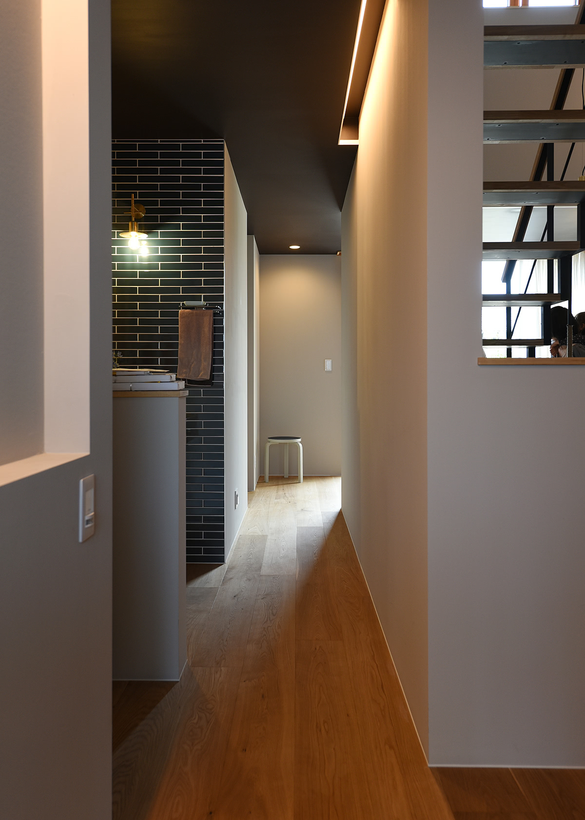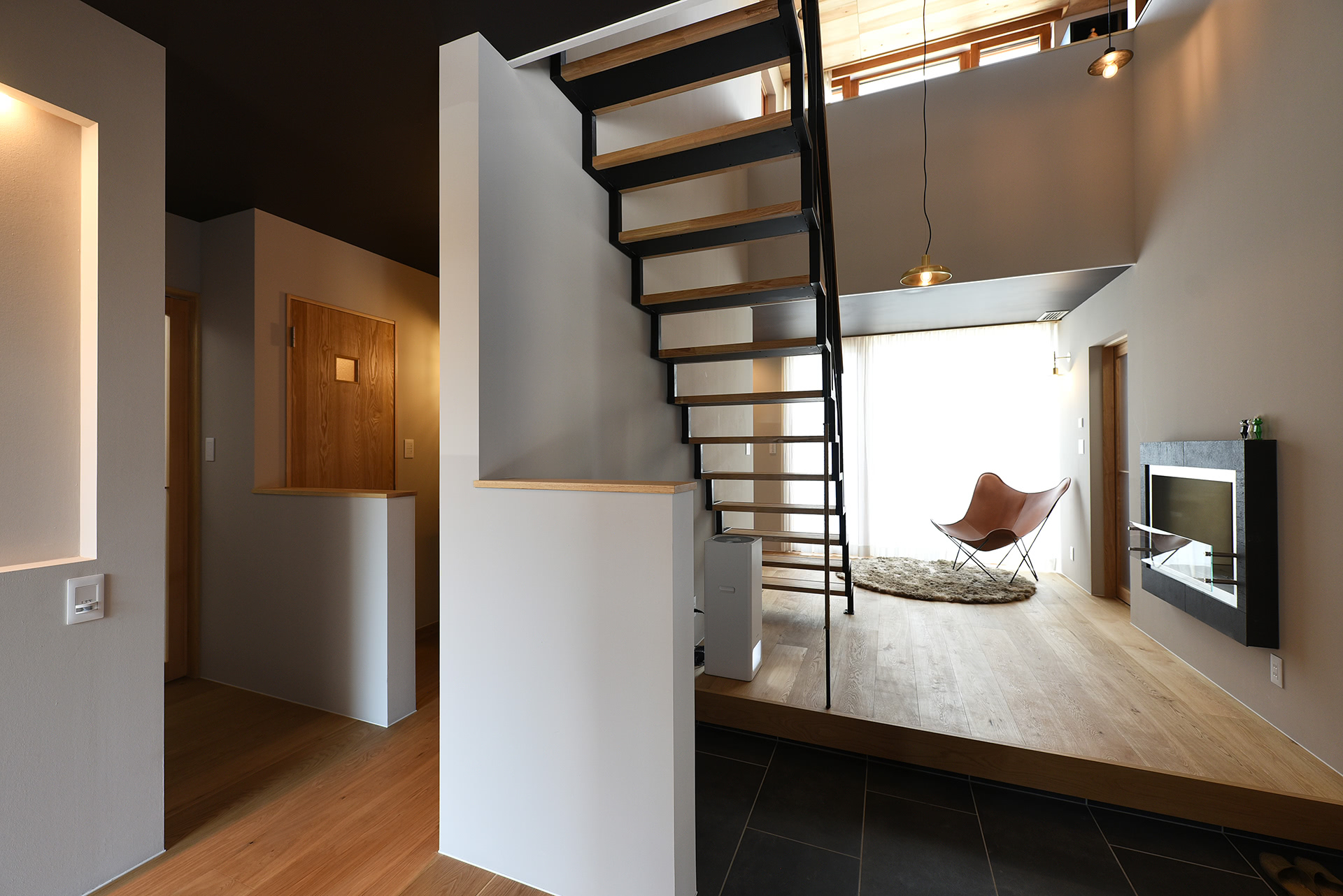 階段上から玄関ホール。右手扉奥は大型シュークローゼット。冬場はバイオエタノール暖炉の炎のゆらぎでお客様を迎えます。