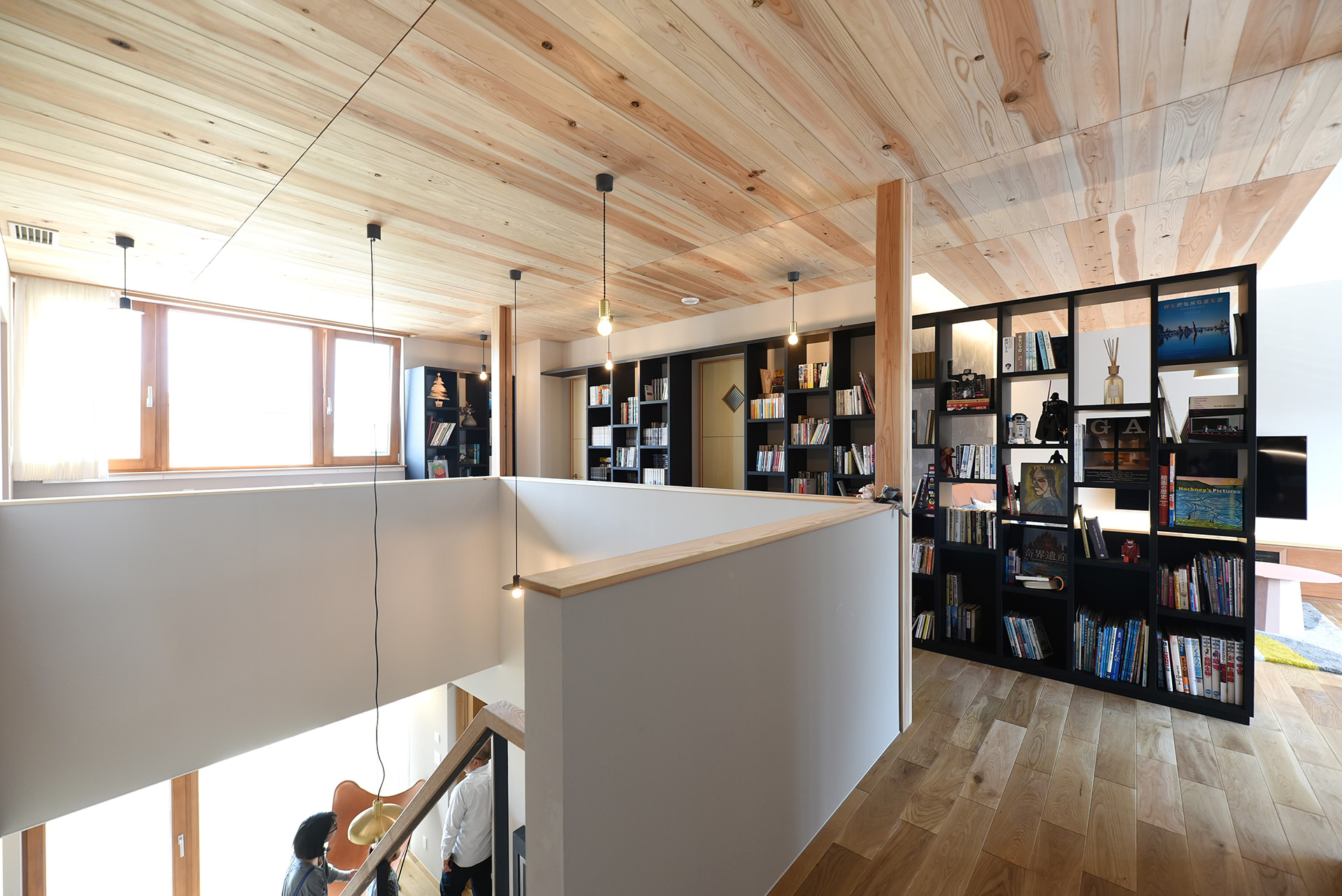 玄関ホールの階段を、本棚のあるファミリースペースがぐるりと囲みます。大きな吹き抜けになりますが、ドイツ基準の高断熱施工で室内の温度・湿度はほぼ上下差がありません。