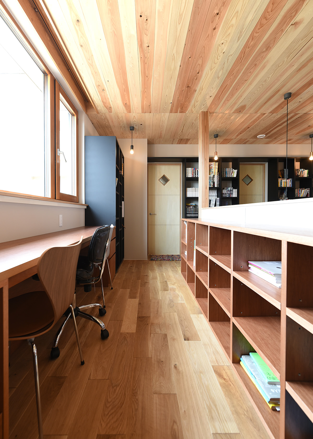 本をさっと取り出して読書や、お子さんの勉強用にスタディスペースもあります。2階床材は北海道産のオーク。