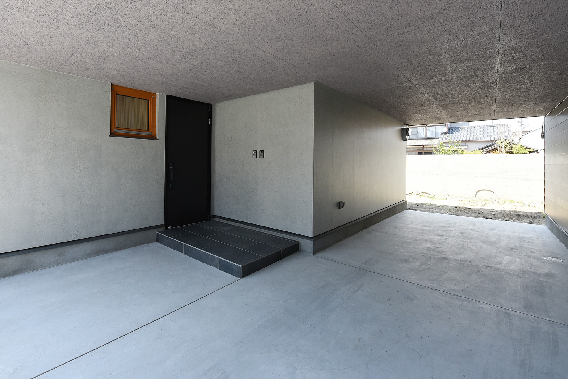 車3台分の容量のあるビルトインガレージ。2世帯住宅なので玄関のインターホンも2つ。天井は木毛セメント板をグレーに塗装。