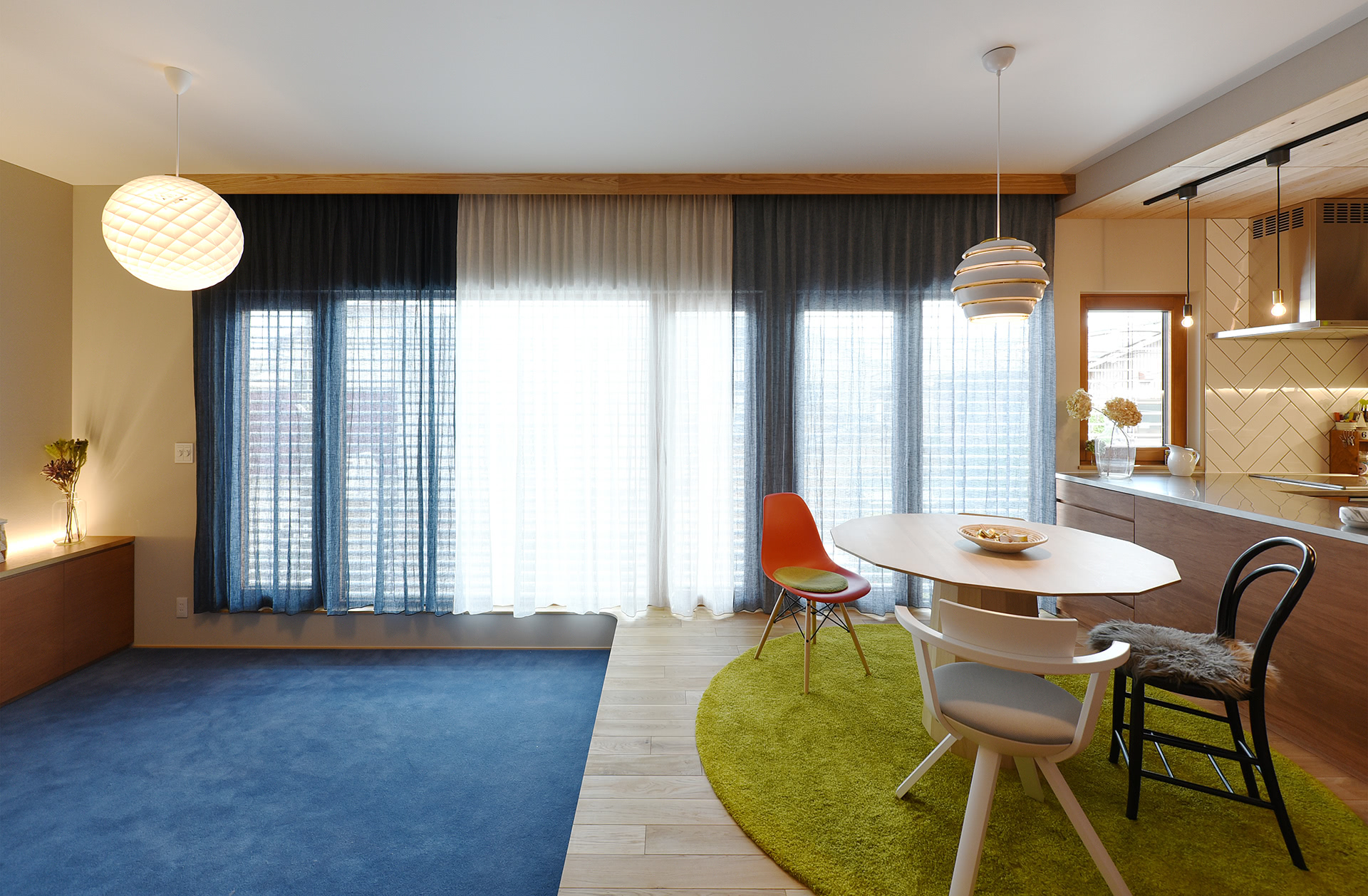 明るい北欧カラーでまとめたダイニングは、レースカーテンの色味を微妙に変えているところがポイント。南面の大きな窓からの日差しを夏は外付けブラインドでカット、逆に冬は積極的に取り入れ、冷暖房エネルギーを最小限に。