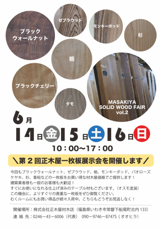 6月14日(金)15日(土)16日(日)には、第2回正木屋一枚板祭を開催します。