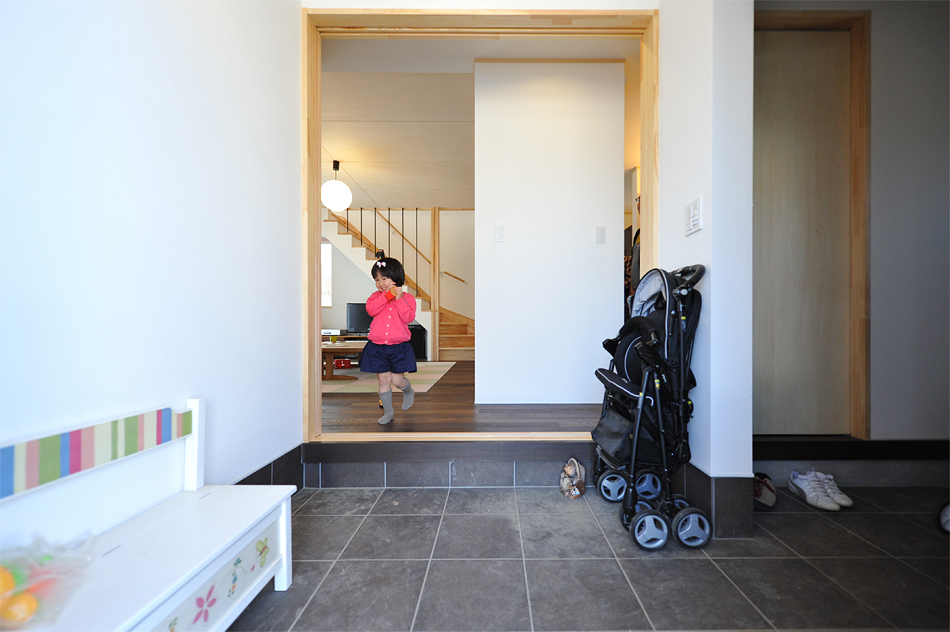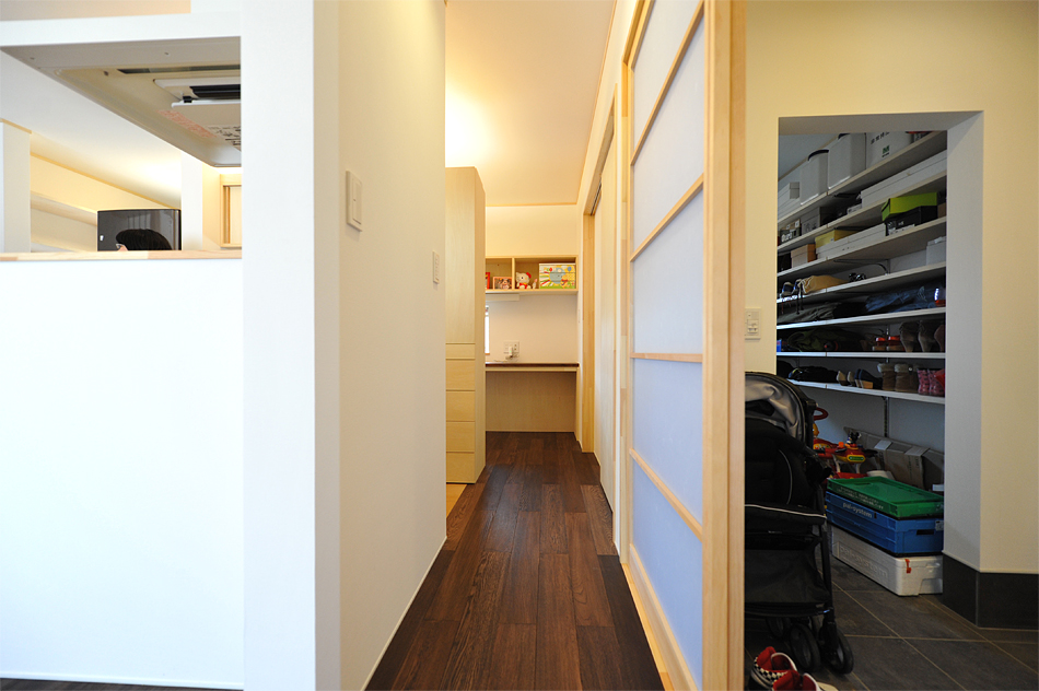 玄関は収納を広めにとり靴と外回りのものをまとめています。右側のドアからはキッチンに直結。