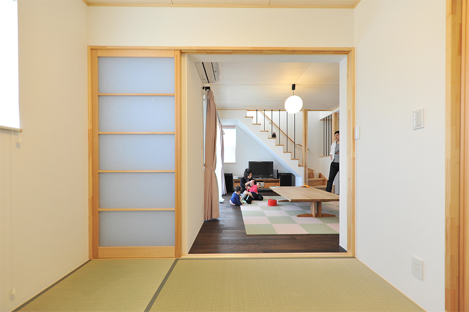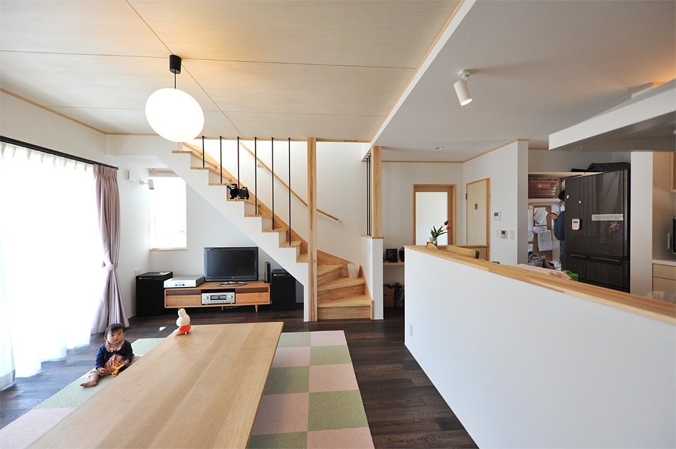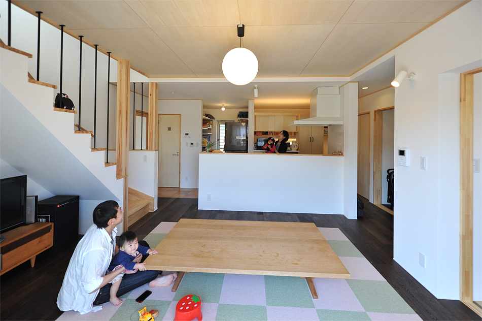 施主様は、4人家族が快適に生活できる必要十分な広さのコンパクトな住まいと、加えて床座での生活を希望されていました。床面積を抑えるため余計な廊下をなくしつつ、シューズクロークやパントリーといった収納を確保。またキッチンを中心に収納やサニタリーを最短距離で配置することで、機能的かつ使いやすい家事動線を実現しています。