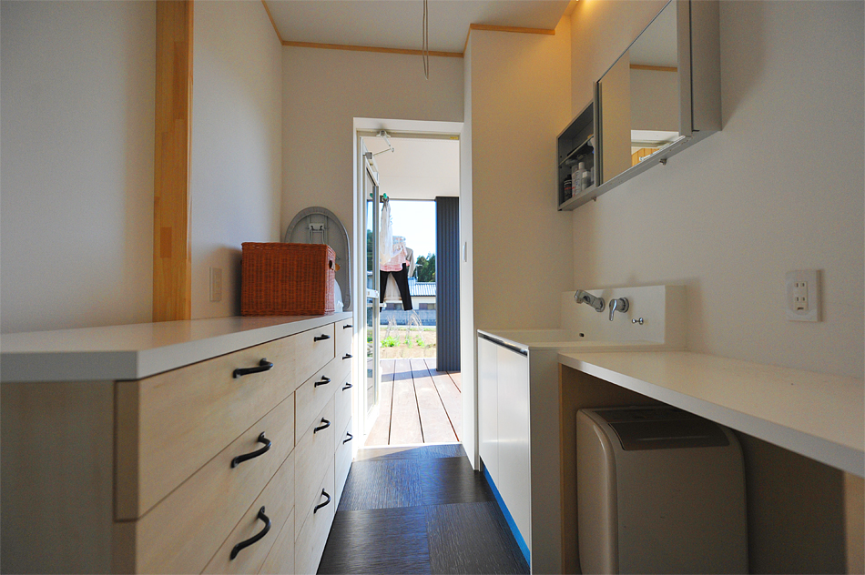 5キッチン脇の洗面脱衣からそのままデッキに洗濯物が干せます。収納もたっぷりと。