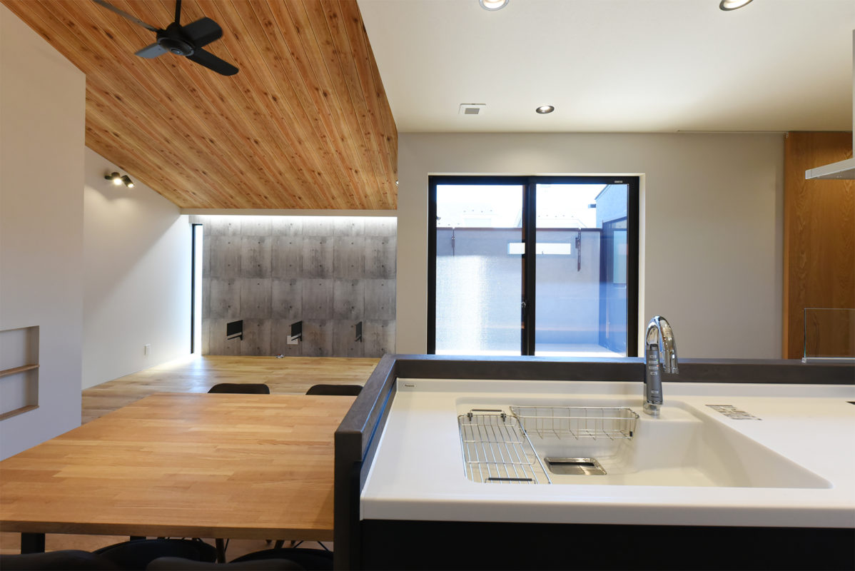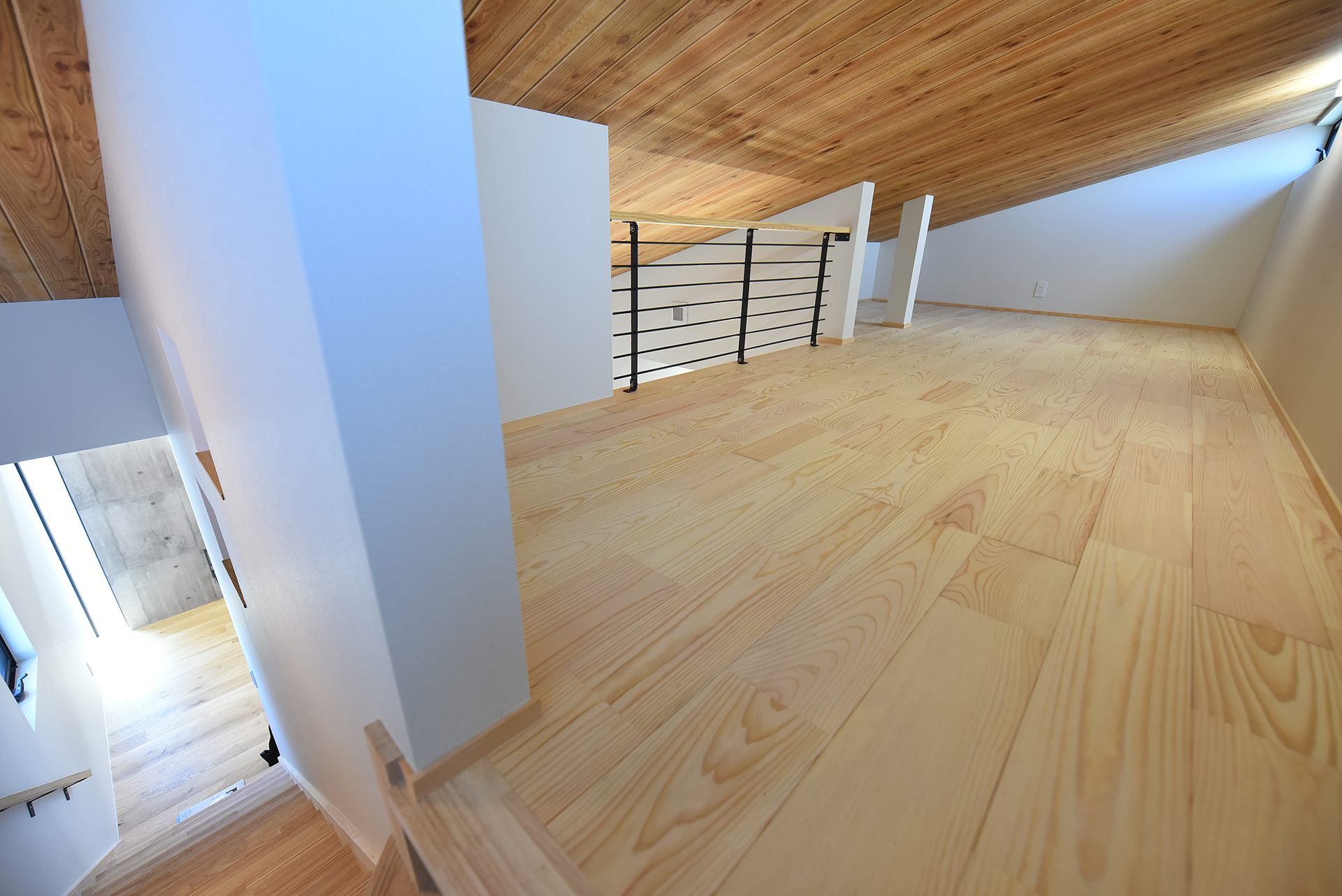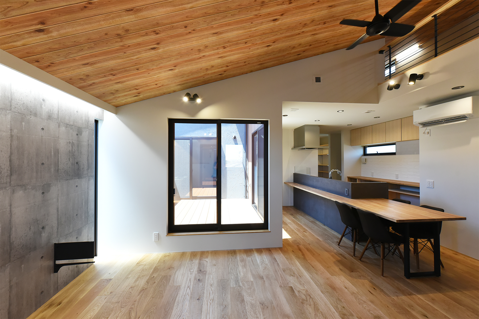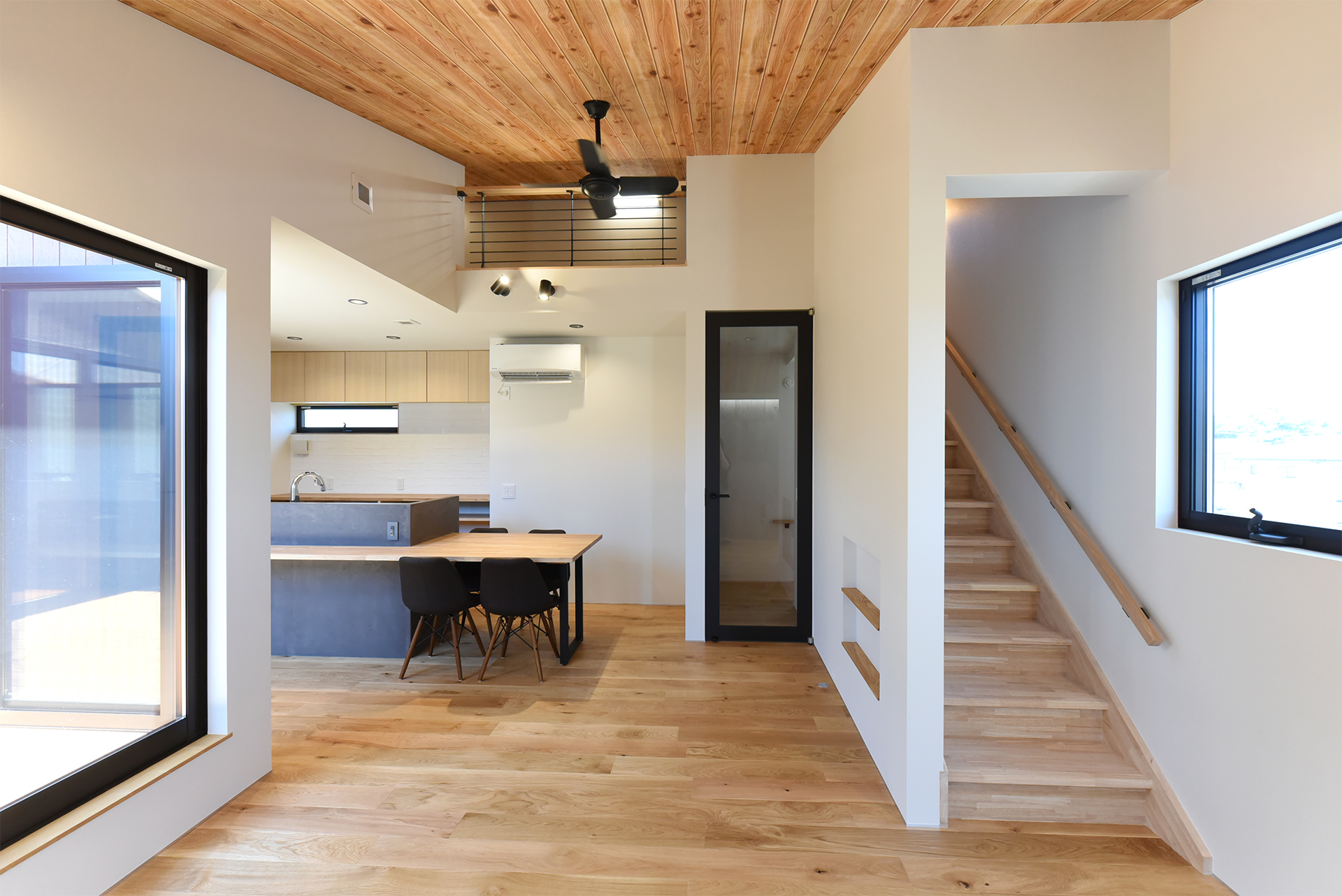 2階のLDK。吹き抜けがご希望だった建主様のために屋根高を高く取り、ロフトを設けました。