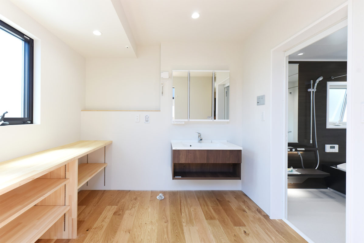 共働きでお忙しいお二人の家事が捗るよう約4.5畳と大きく設けたサニタリールーム。