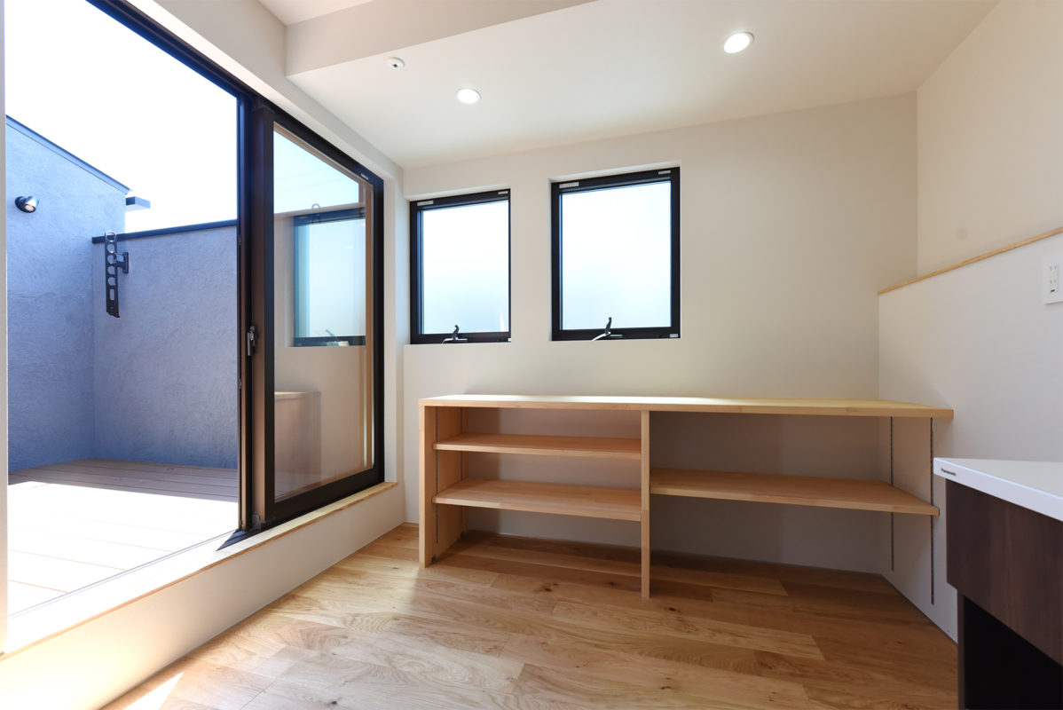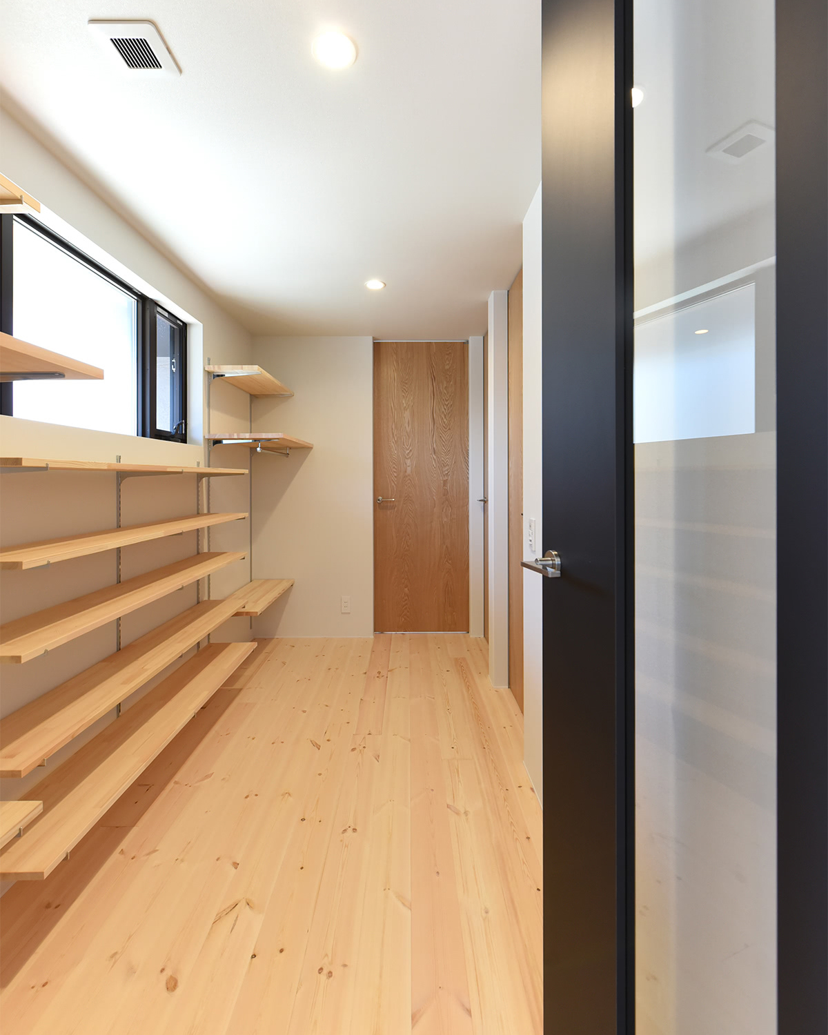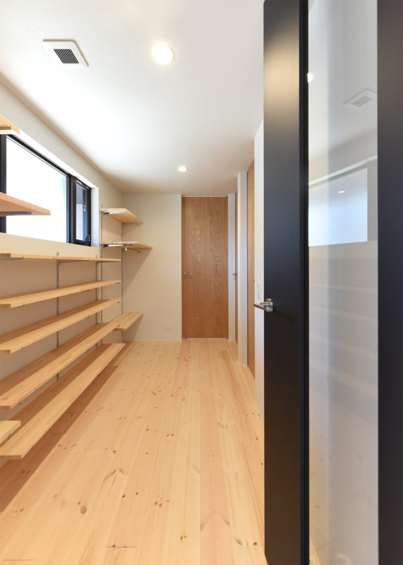 玄関横のドアを開けると各居室に行く前のワンクッション的空間。ここにバックやコートや作業服などを仕舞うことで居室やリビングがモノで散乱するのを防ぐ役目。