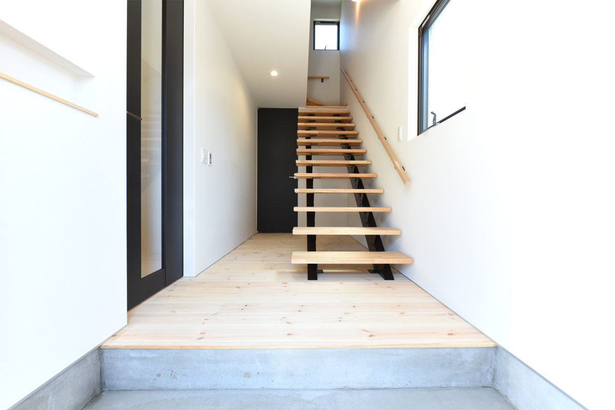 玄関周りには唐松の荒仕上げの横張りで更に外壁を引き立たせます。