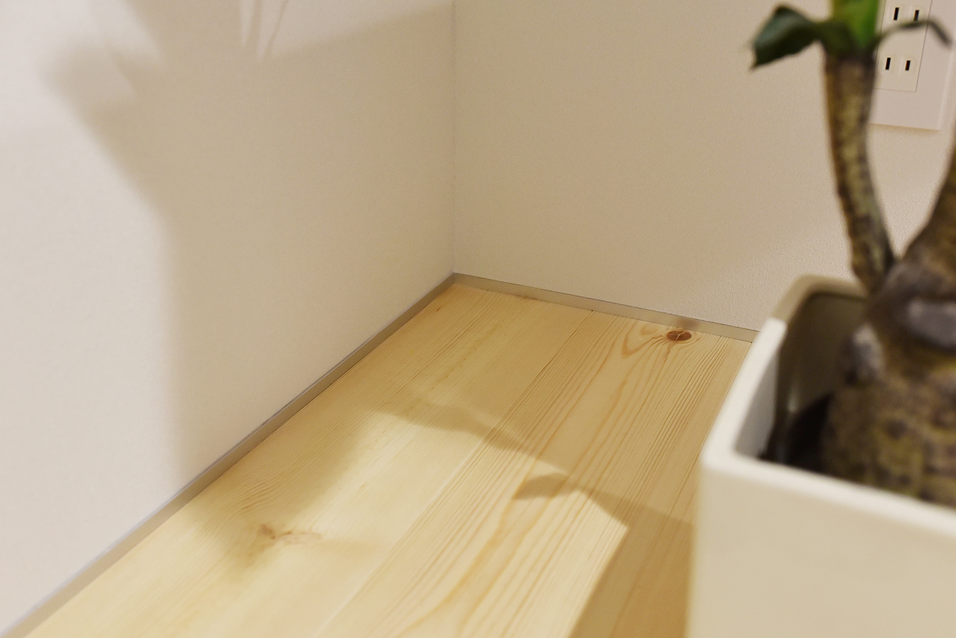 巾木は掃除機などから壁を守る役目を果たしますが、アルミの極細巾木でスッキリと。