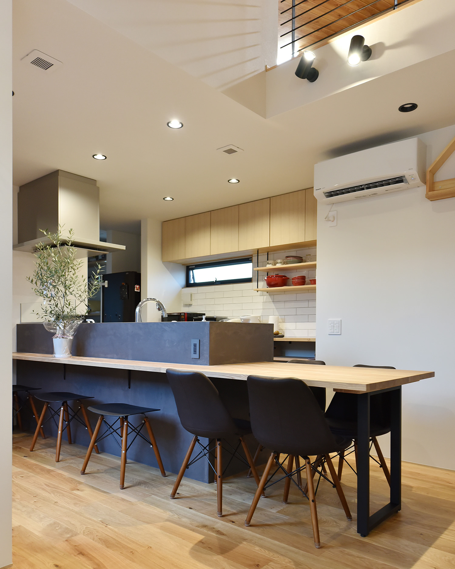 キッチンと一体化したダイニングテーブルとカウンター。キッチンの前にも横にも座れて会話が弾みます。