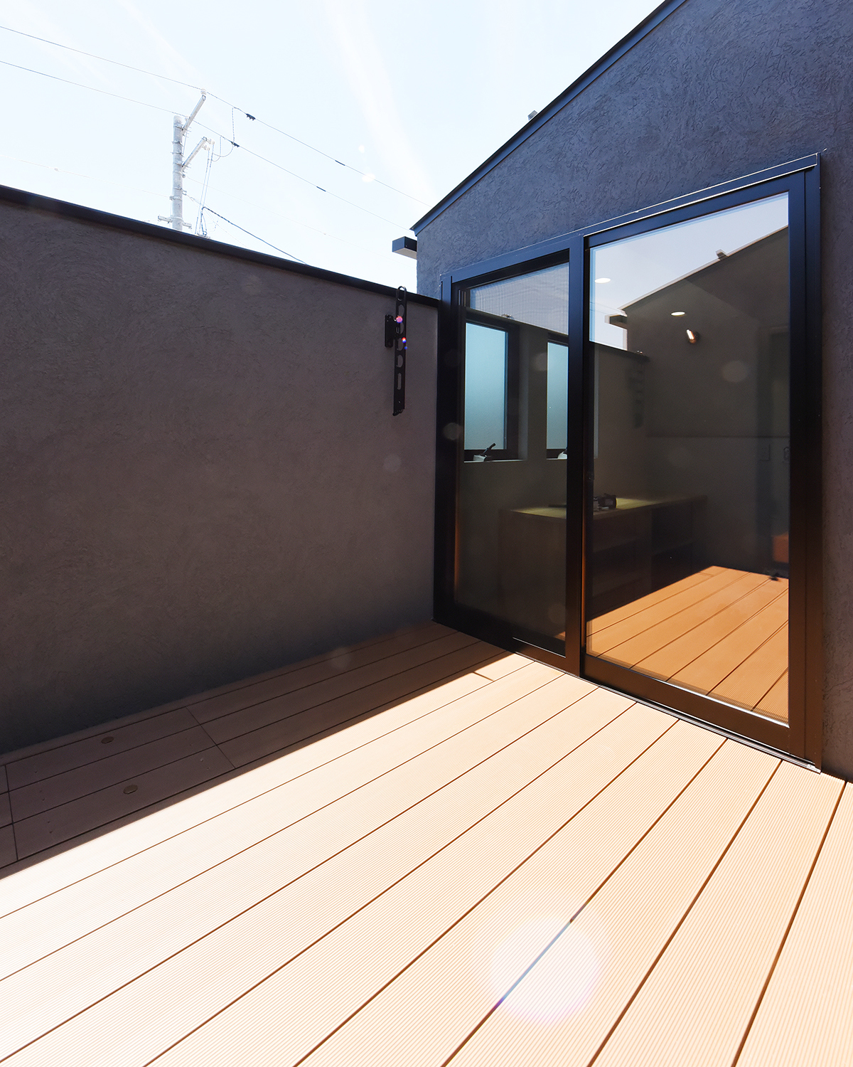 プライベート感を重視してバルコニーは目隠しを高く設け、もう一つのリビングとして活躍。