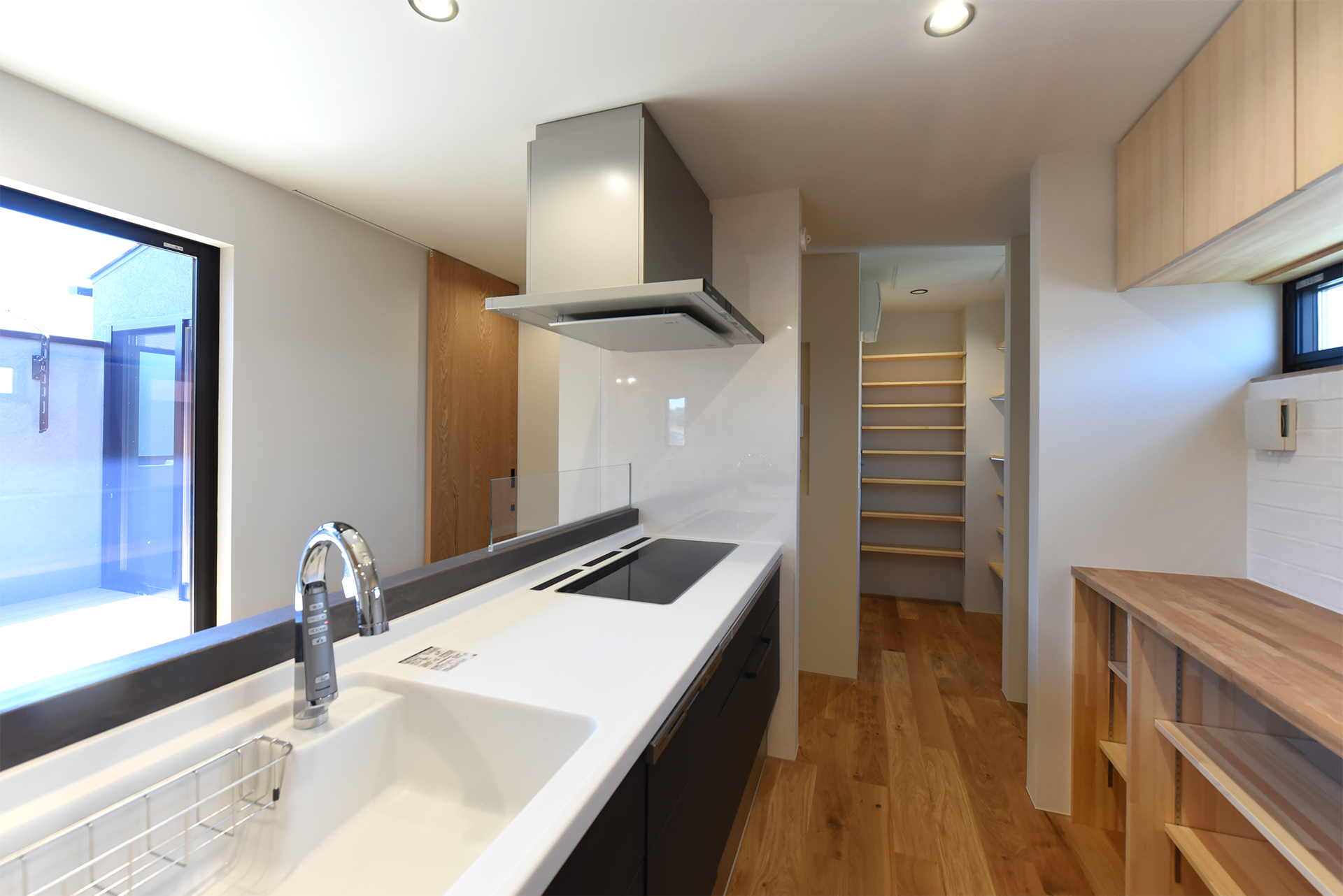 キッチンの奥にパントリー。キッチンを中心に回遊動線になっています。