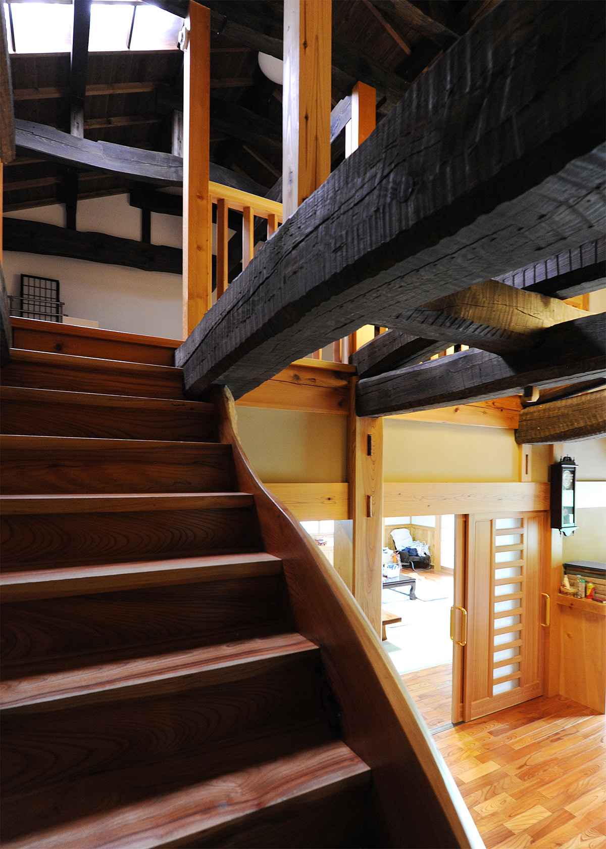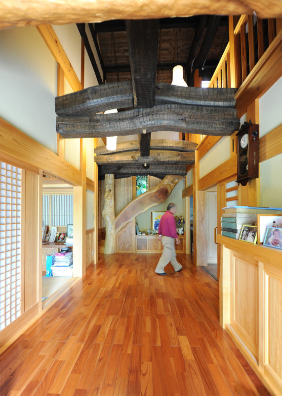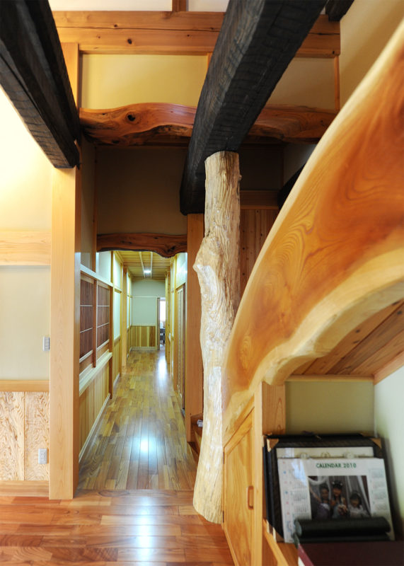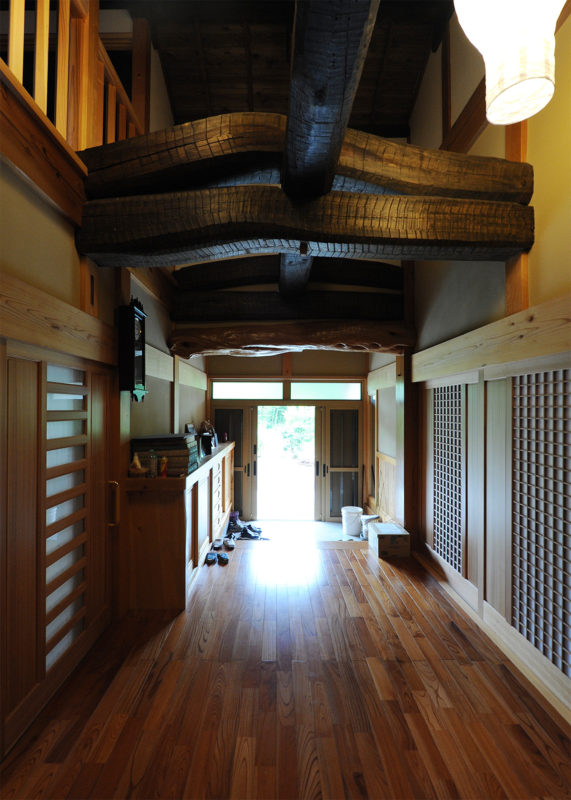 玄関を入ると3重に架かる立派な梁に目を奪われます。地杉の素の形を活かした組み方で、手斧仕上げにしています。様々な樹種を巧みに使って家の顔である玄関に見せ場を作ります。