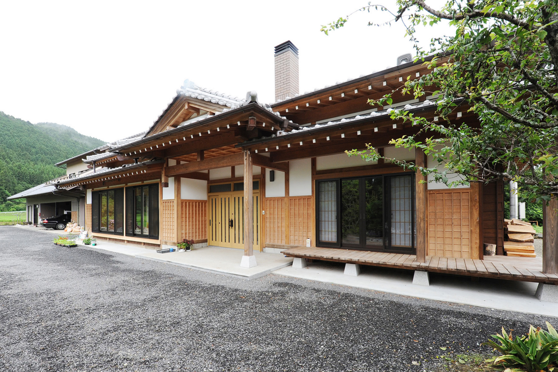 今回ご紹介するのは、鈴平ニューホーム社長の自邸です。和室の掃き出し窓から見えるのは霧雨に煙る山々の緑。入母屋造りの平屋の佇まいが山間部の田園風景に溶け込んでいます。