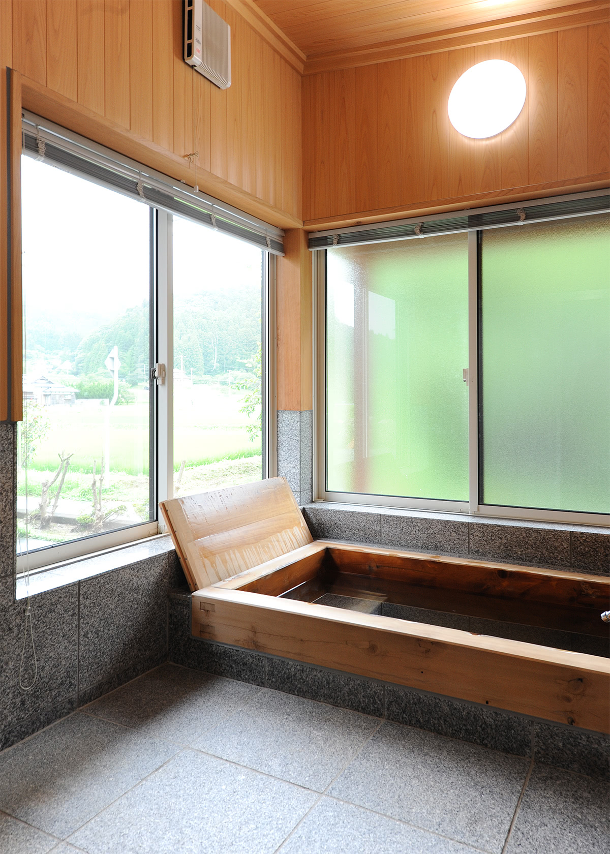 お風呂の湯船は地元産のかやの木。水に強く抗菌作用があります。壁と天井は檜。床は白御影石。