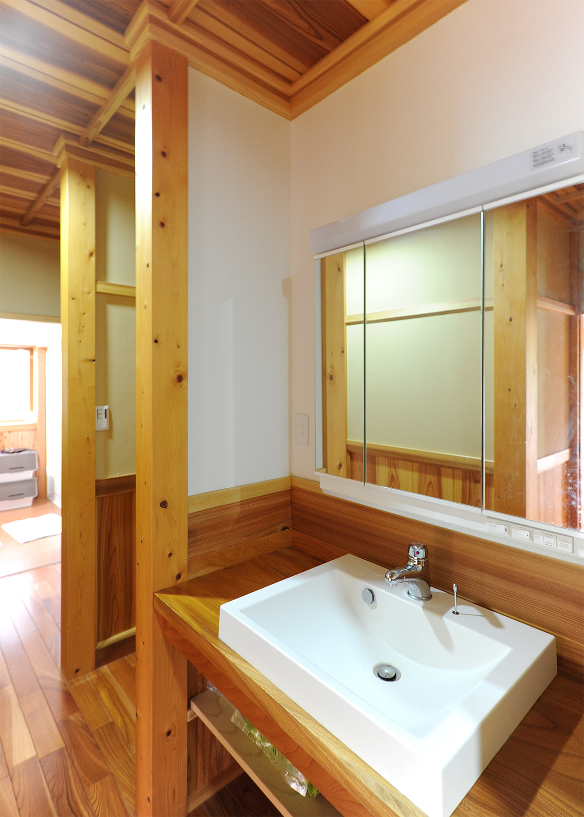 廊下の一角の洗面所も木をたっぷりと使って。床は洗面台とフローリングはケヤキです。