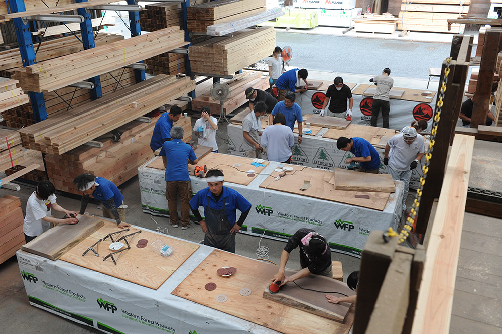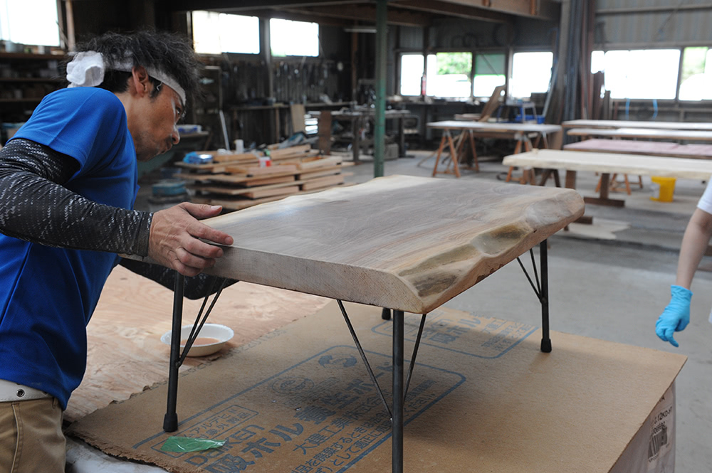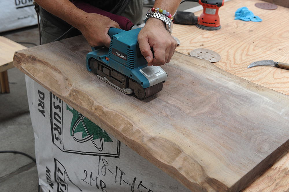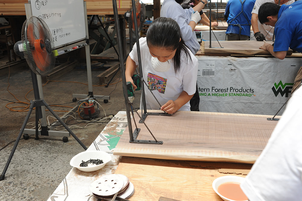 クジ引きで世界に一つの一枚板との出会いのあとは、木工機具を駆使してとにかく削る削る。