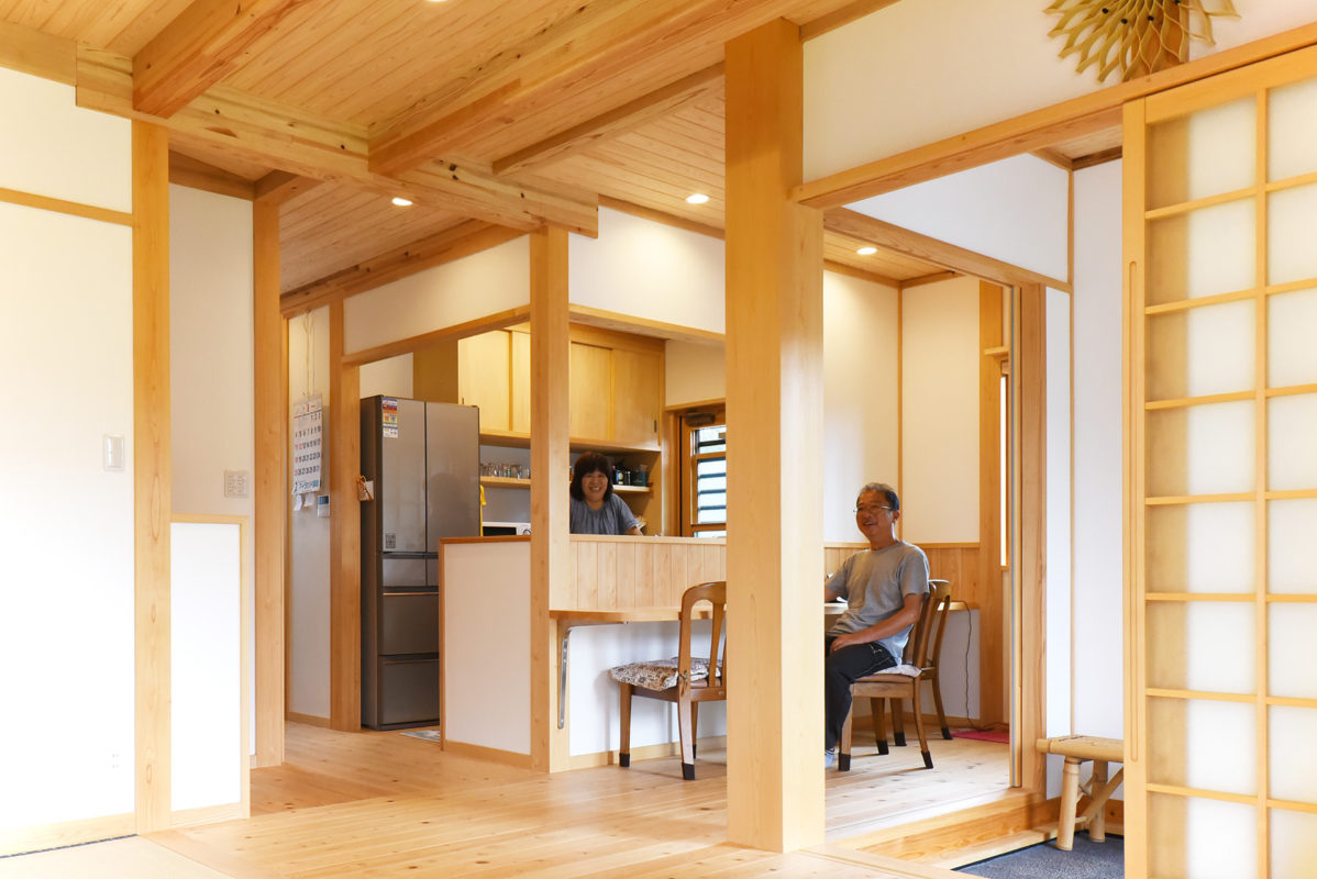 1階は昔で言うところの「二間続きの和室」の変形バージョン。メインの居間部分は桧のフローリングに6畳の畳スペースがあり、奥の和室はお客様が集まったときに大きく使えるように引き込み戸なっています。キッチンからの見通しもよく、大きなワンルームのようになっています。昔の暮らしの良いところは残しつつ、現代のライフスタイルに合わせた間取りです。