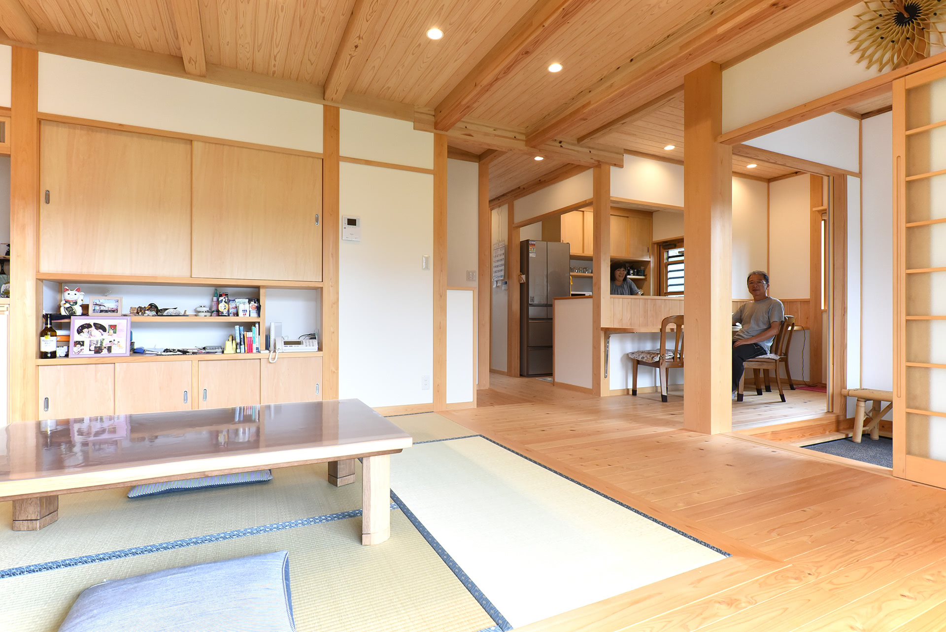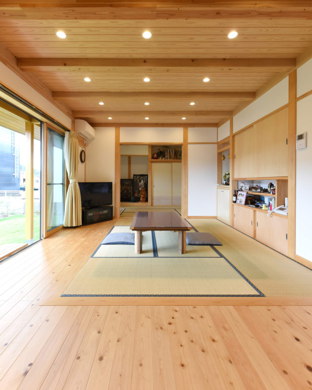 居間では畳スペースで床座で過ごします。ちょっとゴロンと横になれるのがポイントだとか。檜、杉、漆喰、土佐和紙、すべての居室が自然素材の優しさに包まれています。