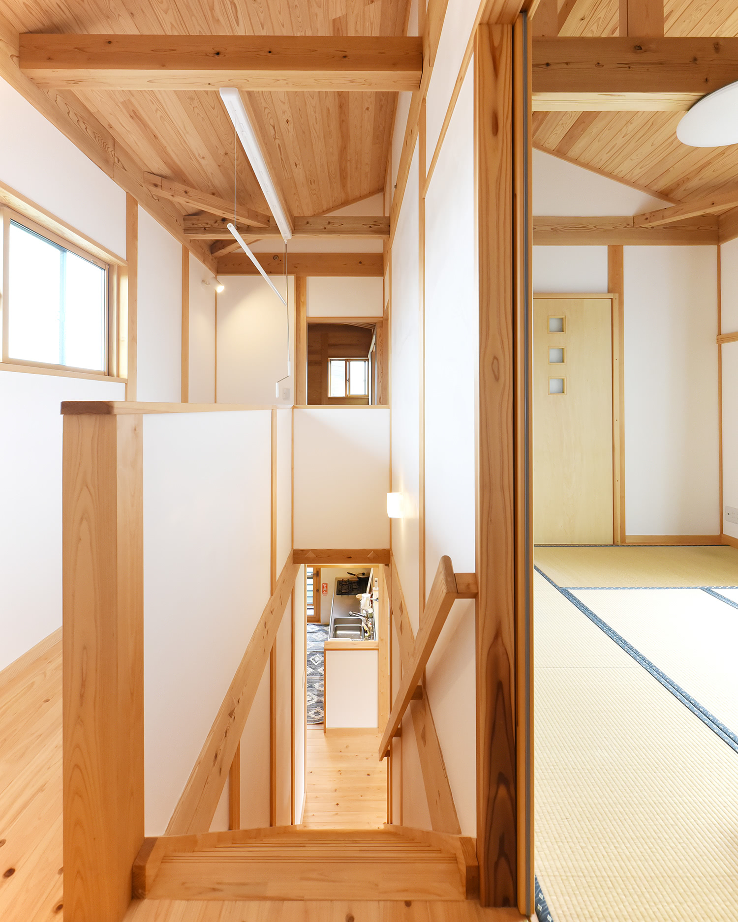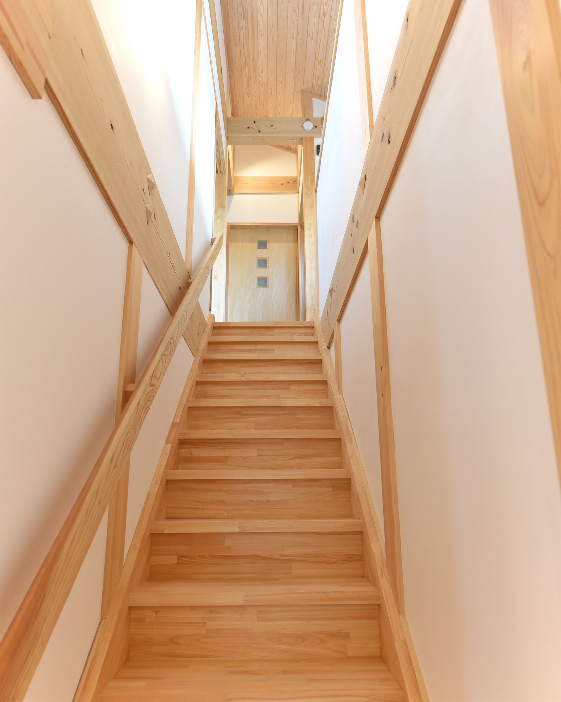 江尻建築ならではの真壁の梁と柱の架構の美しさが楽しめる階段。木部の過半に福島県産材を使用しています。