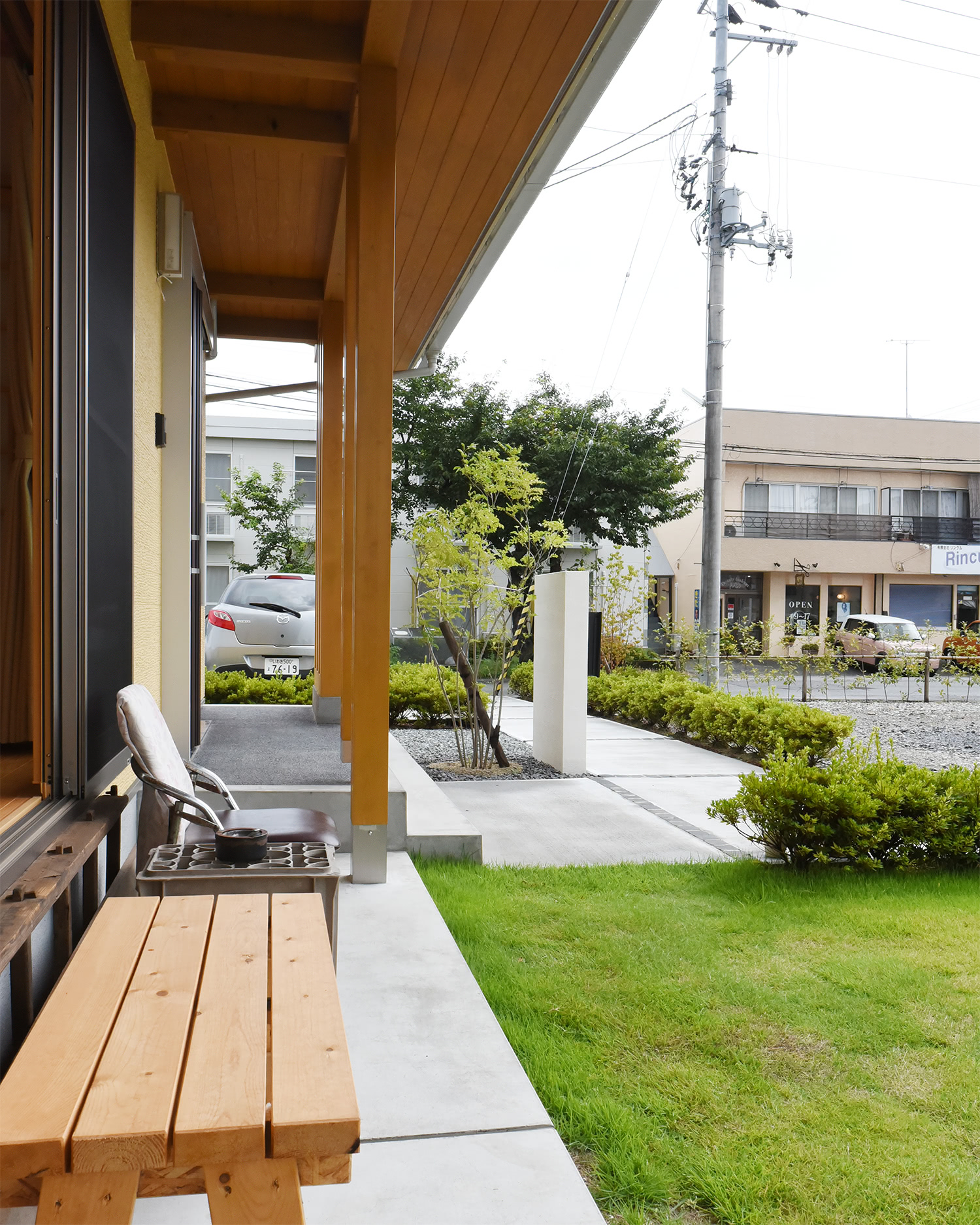 大きく屋根が出ている軒下はご主人のお気に入りの夕涼みの場所。