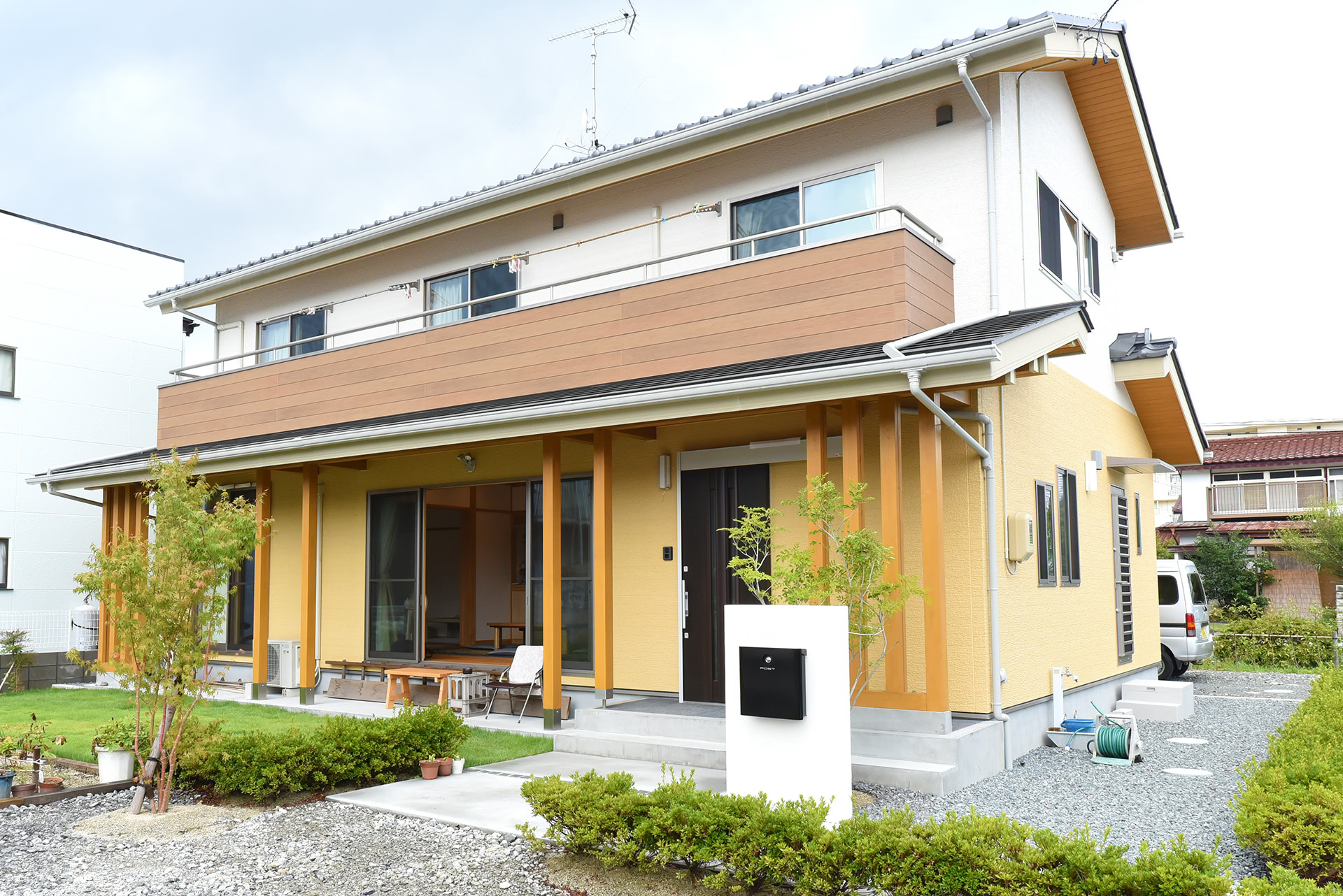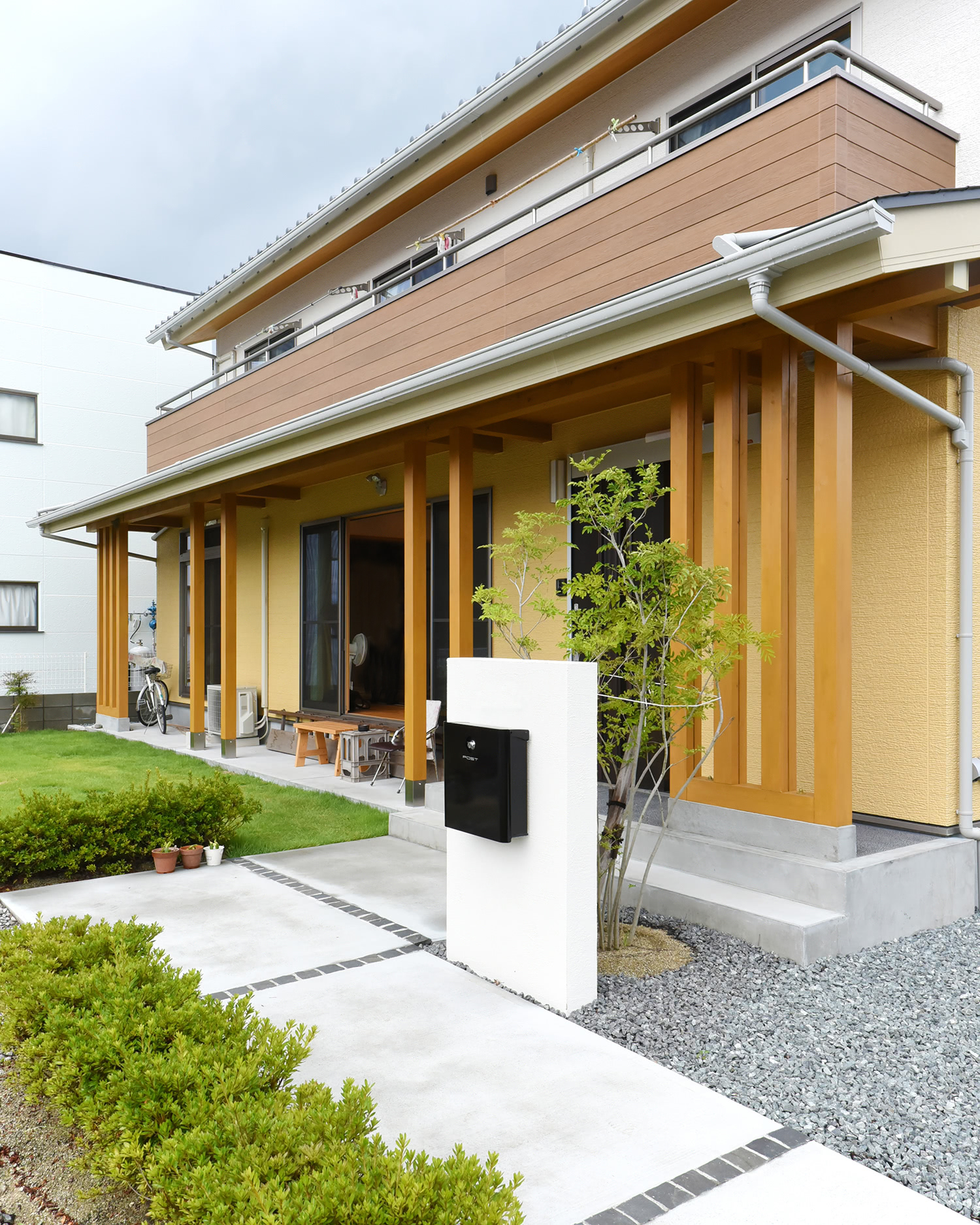 山吹色とアイボリーの外壁に木部を組み合わせ、明るい印象の和モダンの外観になりました。
