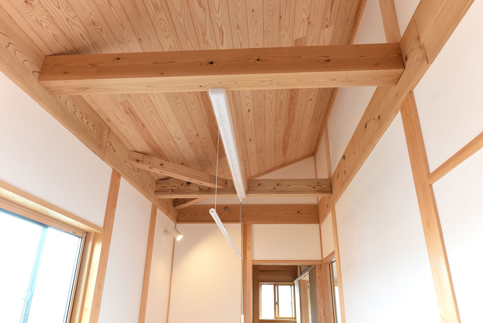 2階の階段スペースの上にある室内物干しは、1階からの空気の抜けもあり便利な場所。