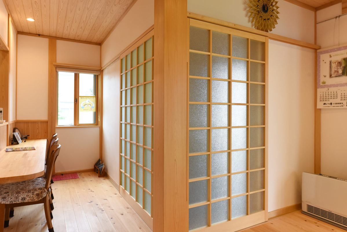 玄関土間を仕切ったところ。広く開口できるよう、通常より大きめのドアを造り付けています。全室出入り口は引き戸になっています。