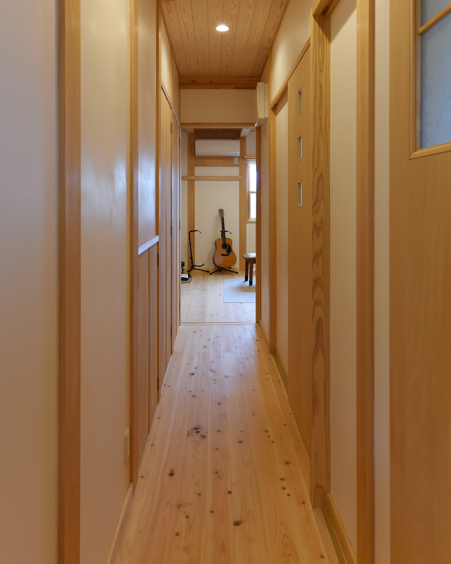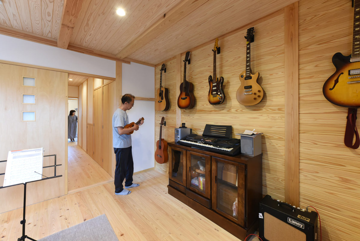 ギターと音楽はご主人と息子さんの共通の趣味。愛用のギターを収納しつつ眺められる趣味の部屋をつくりました。最近はお孫さんも一緒に音楽を楽しんでいるそうです。