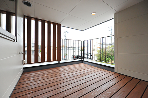 キッチンの前は屋根のある板張りのデッキ(写真左)。キッチン前のデッキスペース。朝食が似合いそう(写真右)。