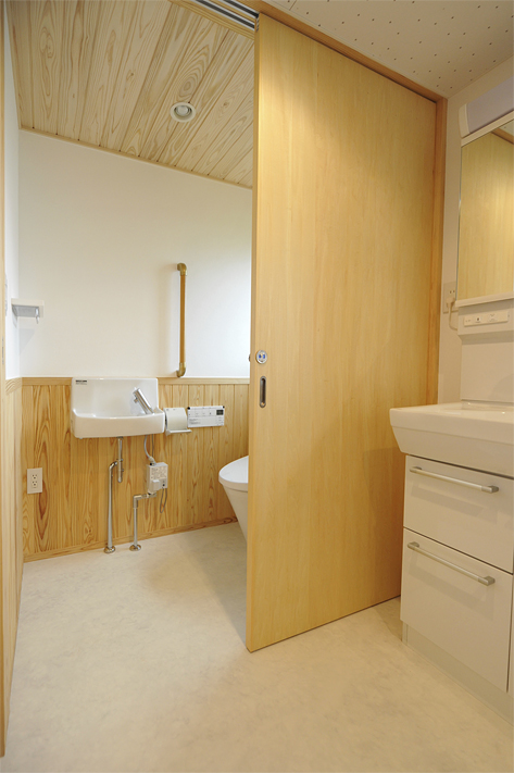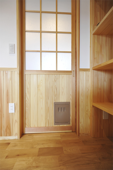 腰壁と天井が杉のバリアフリーな水周り(写真左)。飼い猫が洗面所で用が足せるように専用ドア(写真右)。