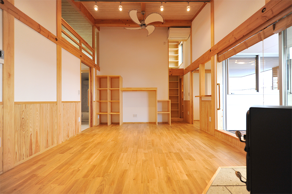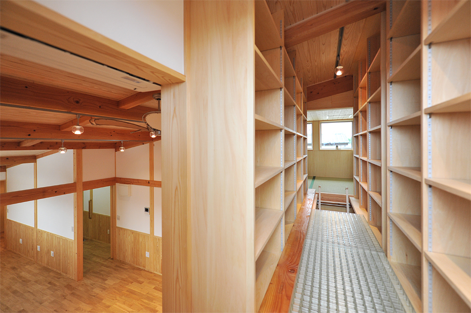 要望は2台分のガレージ+バイク、そして大量の蔵書を収納できる書庫。さらに1階には仕事用の事務所を備え、多機能な家となりました。外張り断熱工法と薪ストーブで暖かさを確保、太陽光パネルも設置して省エネに努めています。また家づくりに積極的に参加して楽しみたいと、自分たちでできるところはやるというスタンスで、壁塗りはほとんどセルフで行いました。
