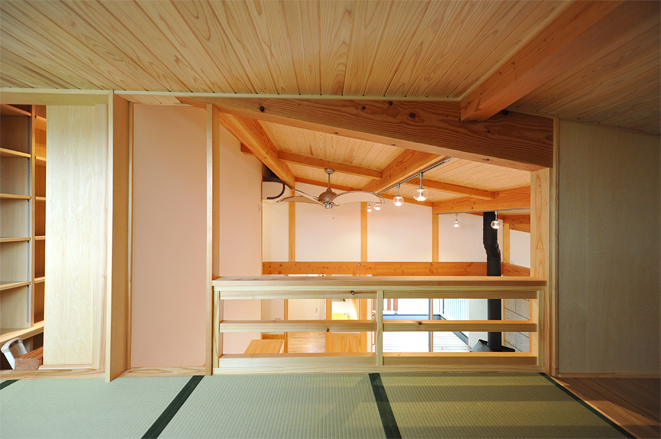 2階が居住スペース。リビングを中心にほぼワンルームなので薪ストーブ1台で暖める。薪は駐車場から滑車で2階に上げられる仕組み。
