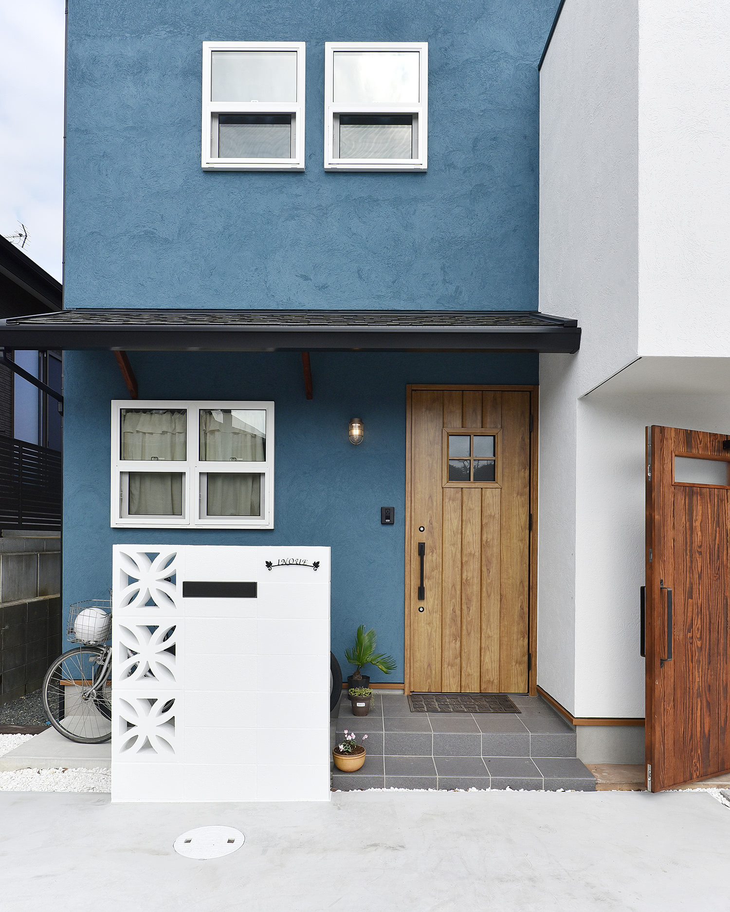 まず外観は鐵庄工務店が得意とするフレンチカントリーのさじ加減を変え、西海岸風にアレンジ。キュービックなカタチに青をと白を組み合わせた外観とガレージ、そしてヤシとソテツの木が青い空にマッチして海沿いのテラスハウスといった趣。ご予算の中で建坪を30坪以内と想定するとビルトインガレージは難しいと思っていたところ「主人にガレージをプレゼントしたい。」という優しい奥様の一言に心動かされました。