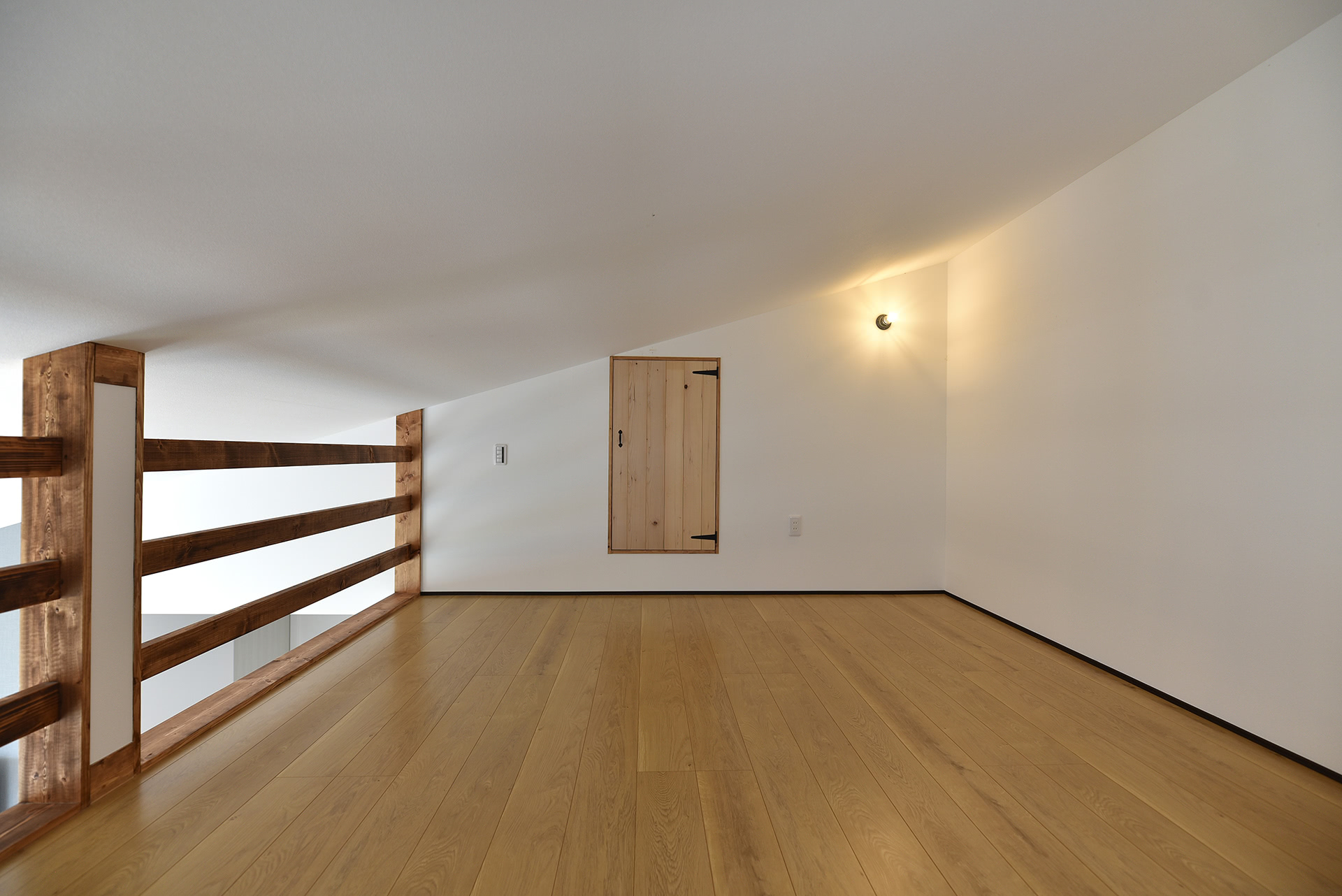 限られた床面積の中でビルトインガレージをつくると居住空間に影響が出てしまいますが、①各居室を極力小さく ②2階リビングにロフトを設けて開放的な空間 ③収納を一元化 でガレージを実現しました。