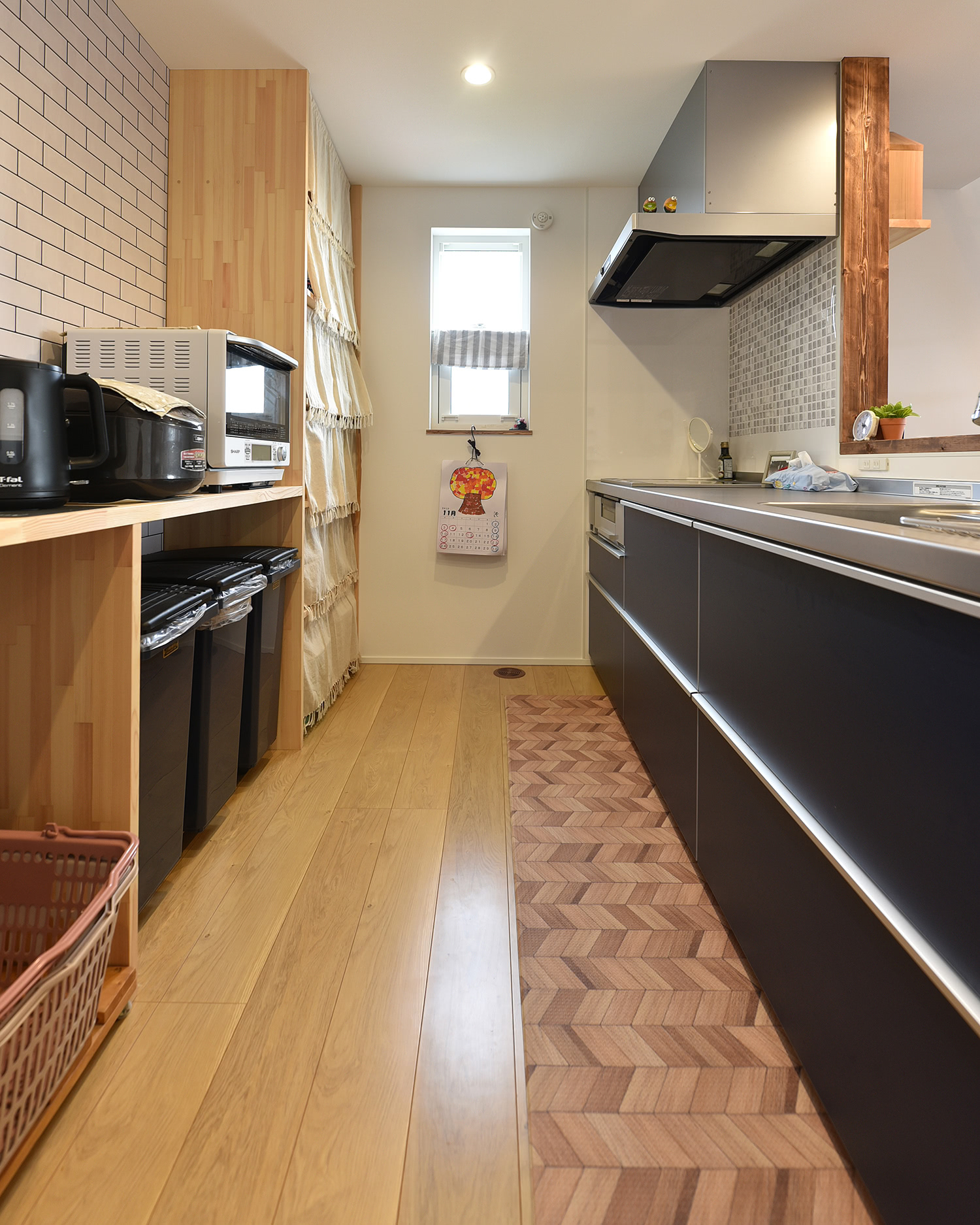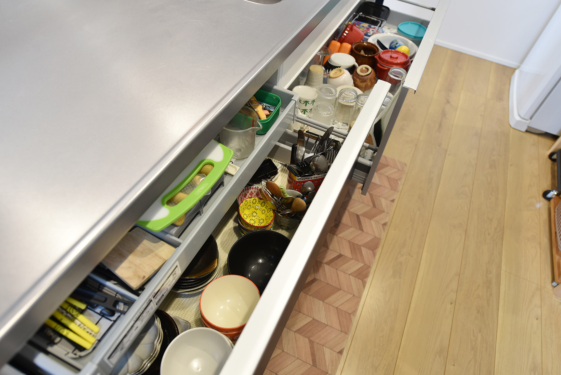 食器類はキッチン下の引き出し収納ですべてまかなえています。収納上手。