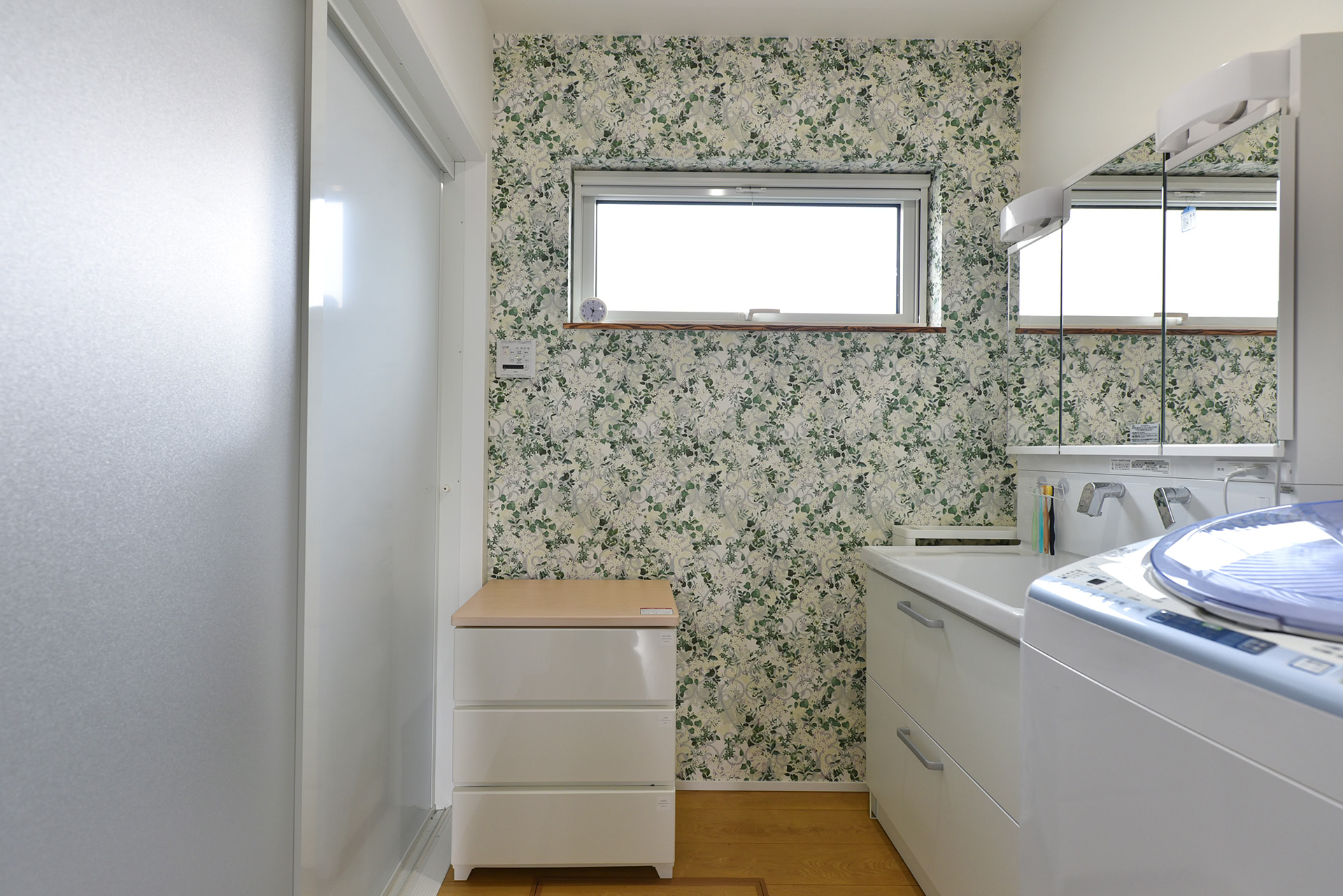 お花好きの奥様のオーダーで洗面脱衣とトイレは大胆な花柄の壁紙。
