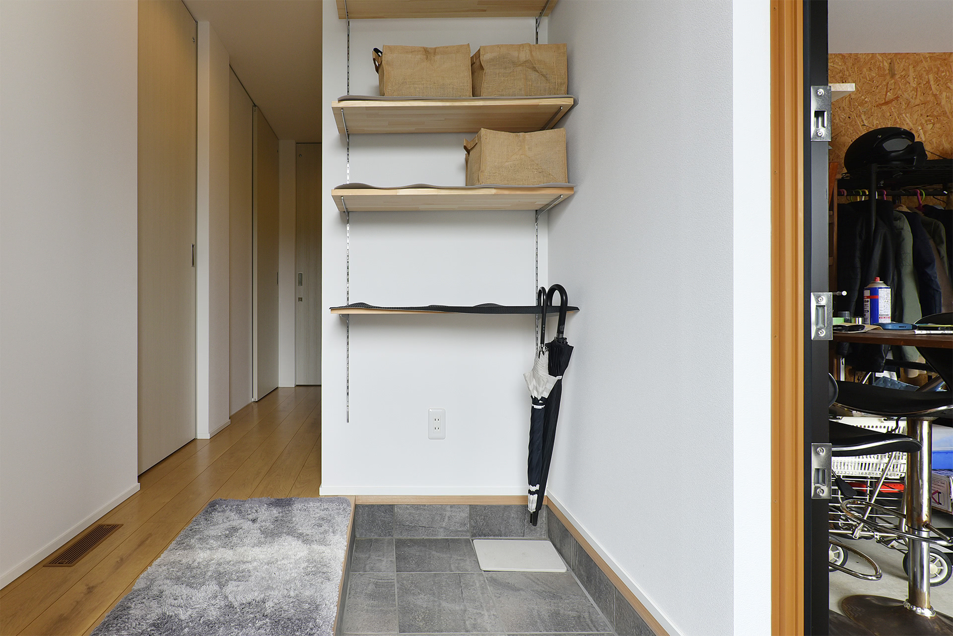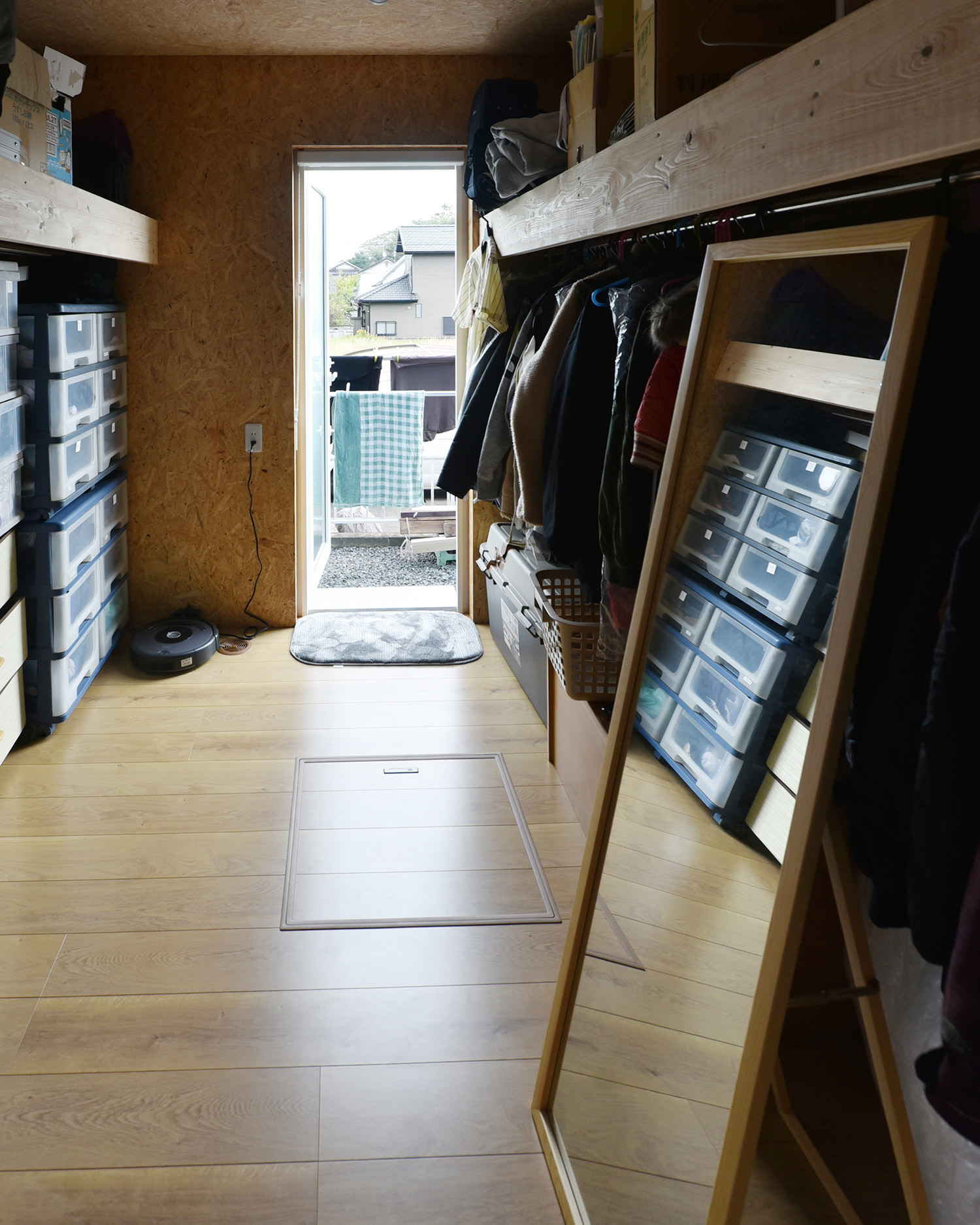 収納は一元化。家族の衣類やキャンプ用品など1階の収納部屋にすべて収納。勝手口を出ると洗濯物干し場があるので、家事も一気に片付きます。