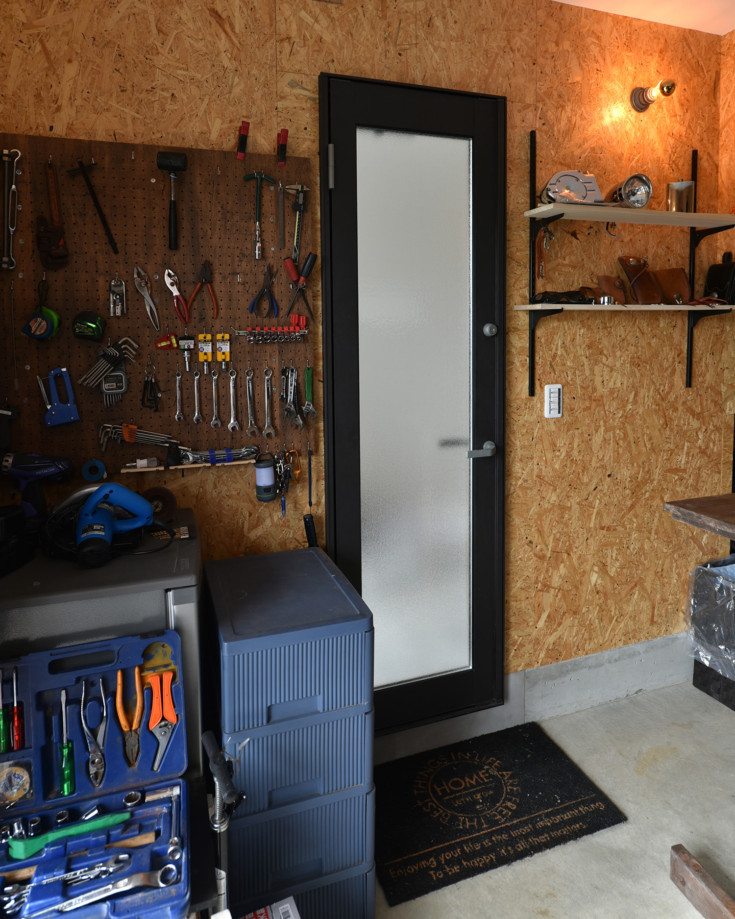 工具と好きなものに囲まれた夢の空間。ガラスドアの向こうは玄関。